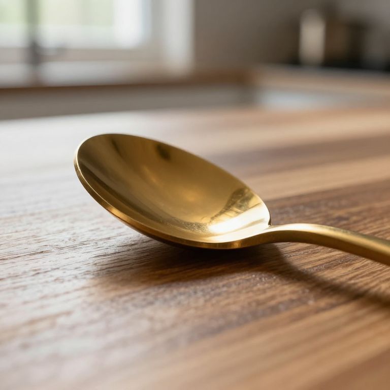 Golden spoon with reflective surface lies on a sunlit wooden table, creating a warm, glowing effect in a softly blurred kitchen background.