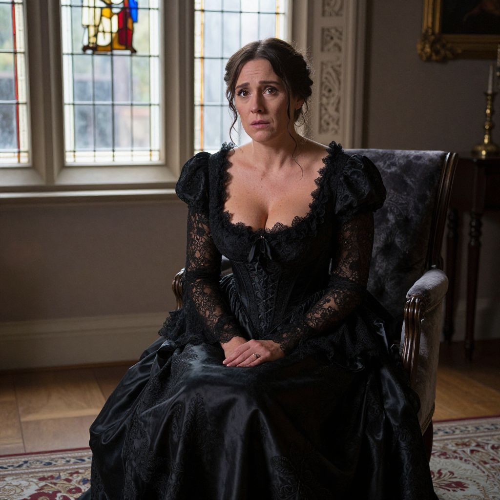 A detailed, realistic image of a woman in her 40s wearing a full Victorian mourning dress, including a black satin skirt, lace overlay, and a velvet-lined bodice, sitting on a velvet chair in a gothic-style estate drawing room with tall windows and stained glass, her face elegant and expressive, with natural expressions of grief, soft light coming from the window casting long shadows. The woman has big breasts and cute face