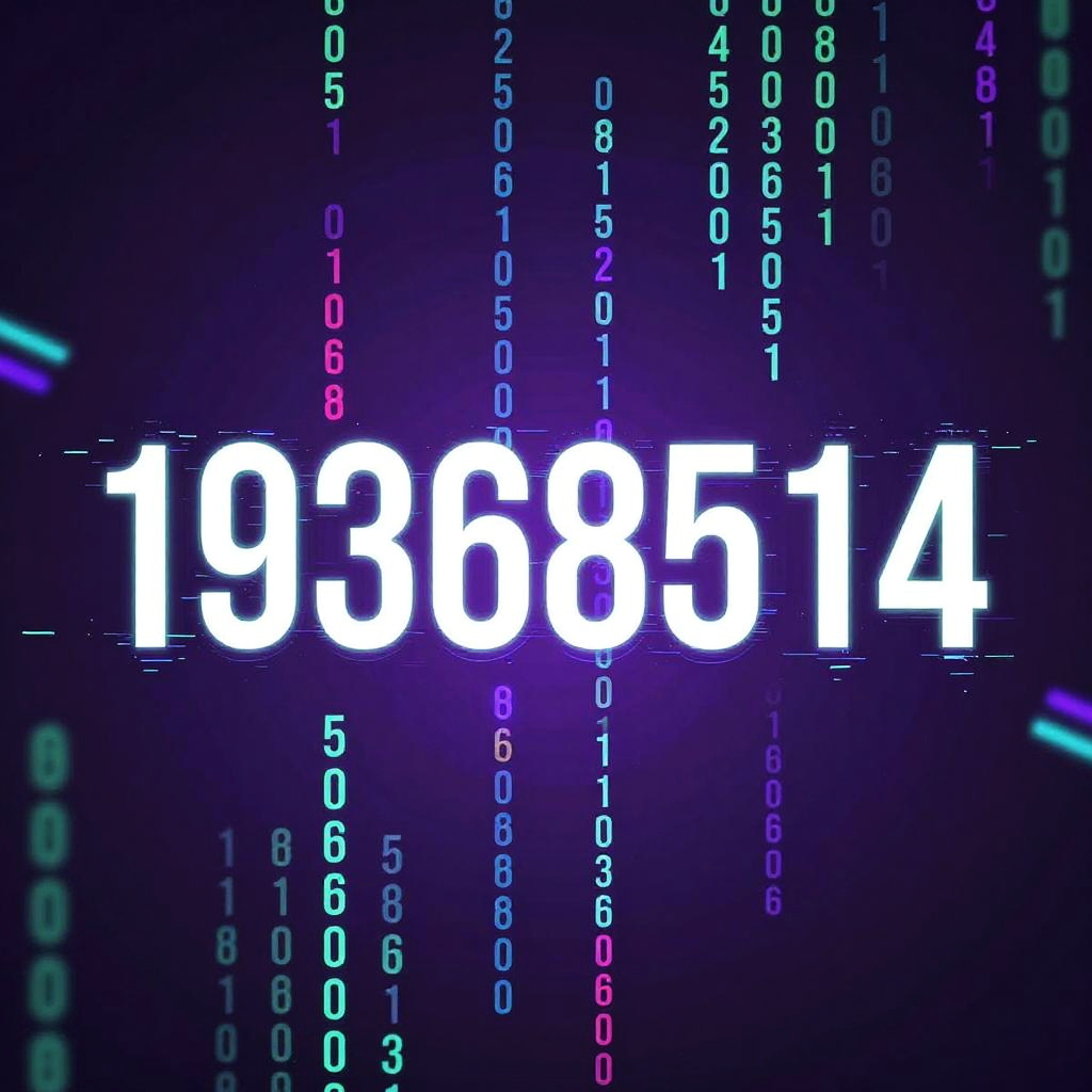 19368514, a vibrant digital matrix with cascading numbers and codes, featuring the sequence prominently in the center, with a deep purple and teal color scheme, dynamic glitch effects, and an immersive virtual reality atmosphere.