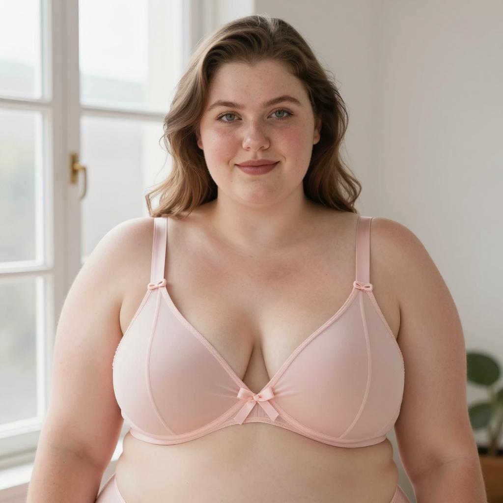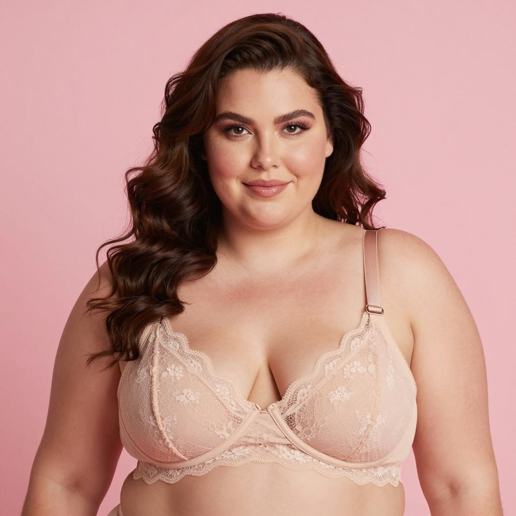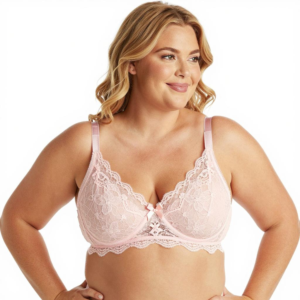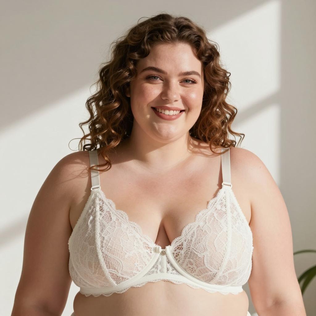 Plus-size woman with light skin and long blonde hair, wearing a white lace bra with pink floral patterns. She is standing front-facing with visible bra straps and a slight smile. The background is softly blurred with wooden shelves holding white objects, highlighting the intimate apparel.