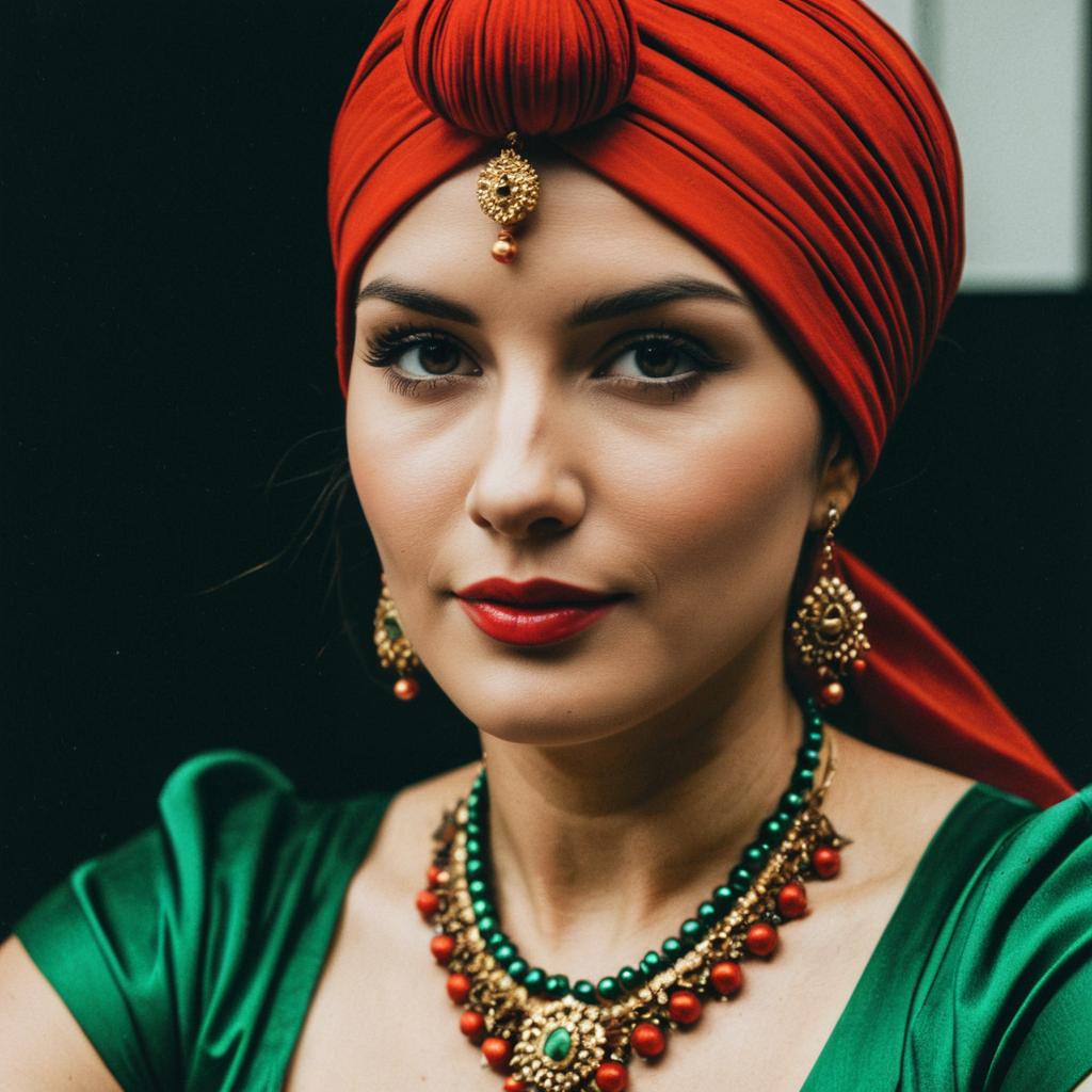 Spice Costume, a close up of a woman in a red turban and a green dress