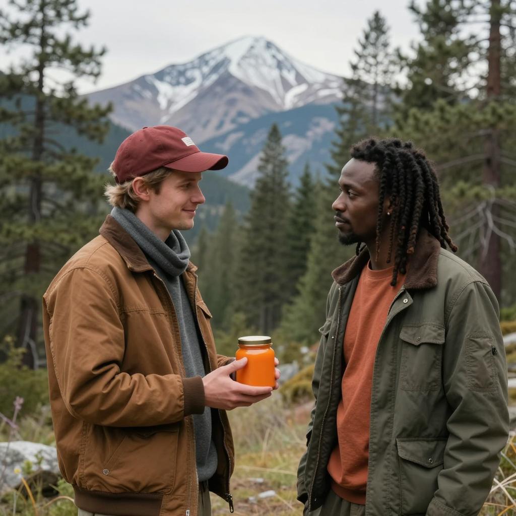 Photograph of two men standing in a desert with sandy dunes in the background. The man on the left has long brown hair, wears a black t-shirt and black cap, and is smiling with his mouth open. The man on the right has dark skin, is shirtless with a red headband, multiple necklaces, an armband on his upper arm, and looks intently at the other man while keeping his arms behind his back.