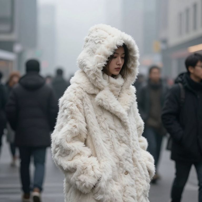 Foggy cityscape reveals a solitary figure clad in an otherworldly, textured white fur coat and matching hood, standing amidst a crowd of indistinct pedestrians, their forms blurred by the misty atmosphere.