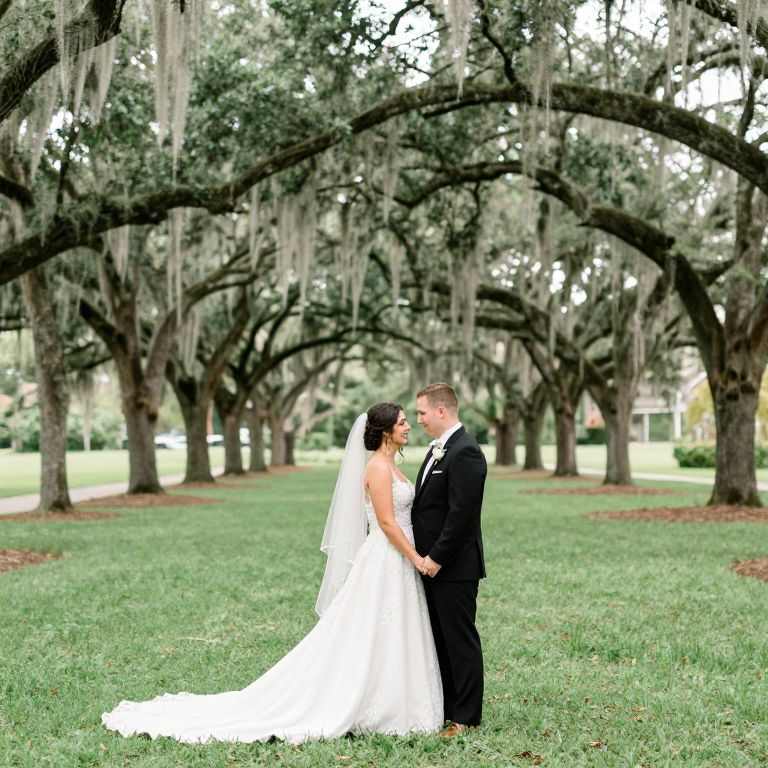 Bride and groom stand hand-in-hand in a picturesque outdoor setting, surrounded by a row of tall trees and lush green grass, as they pose for wedding photos captured by Ailyn La Torre Photography, coordinated by Oh So Classy Events in Tampa.