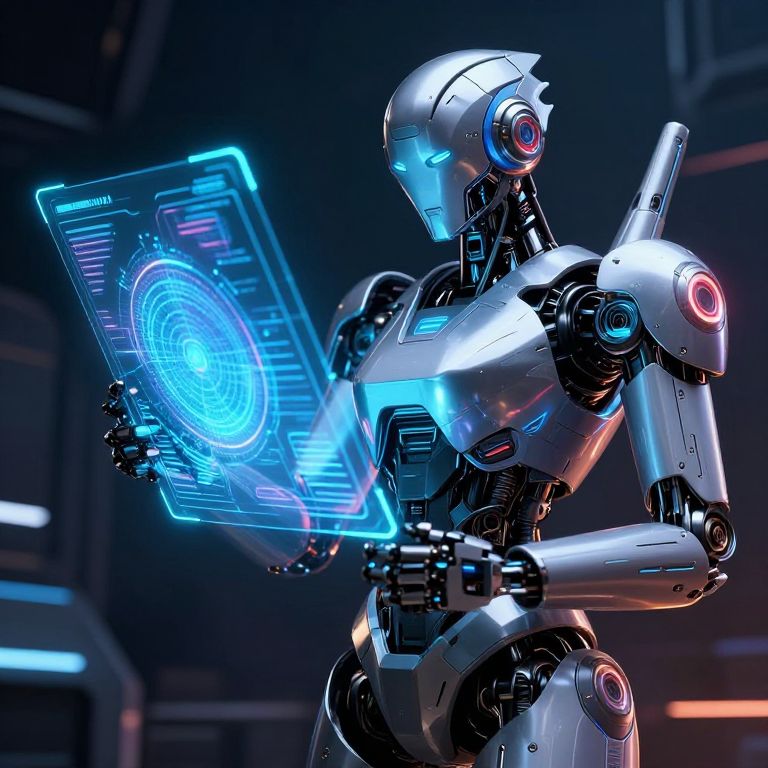 Digital CGI of a silver, futuristic robot holding a glowing blue holographic interface, set against a dark, high-tech lab background.