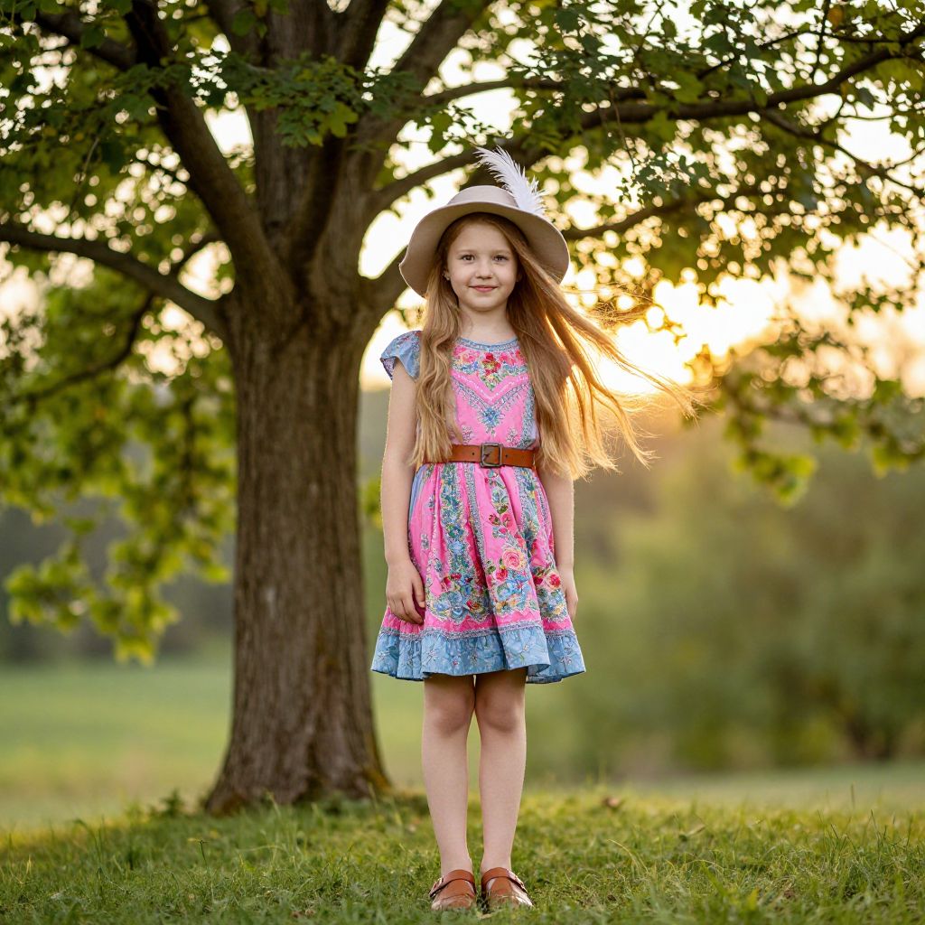 A beautiful young girl with long, flowing blonde hair, wearing a vibrant pink and blue floral dress adorned with delicate embroidery, secured by a brown leather belt and paired with brown leather shoes. She is wearing a soft, wide-brimmed hat with a white feather, adding a touch of elegance and charm. She stands confidently in front of a tall, lush deciduous tree with green leaves and a soft golden sunrise behind her, creating a warm, natural, and serene atmosphere. The scene is softly lit, with gentle shadows and a peaceful outdoor setting, capturing her joyful and carefree expression.