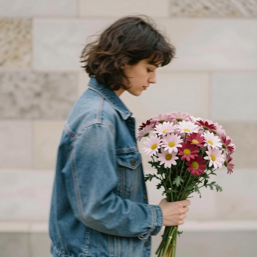Person with short dark hair holding a bouquet of pink and red daisies, wearing a blue denim jacket, leaning forward with back to the camera. Background has blurred stone wall. Image is a photograph with motion blur effect.