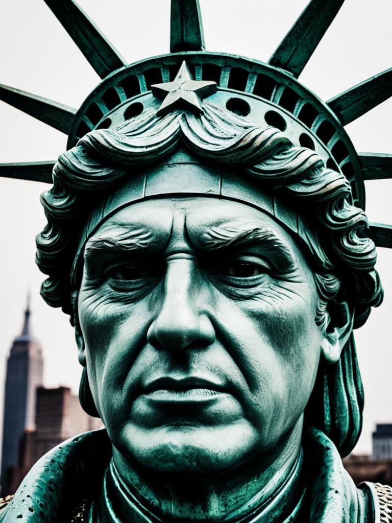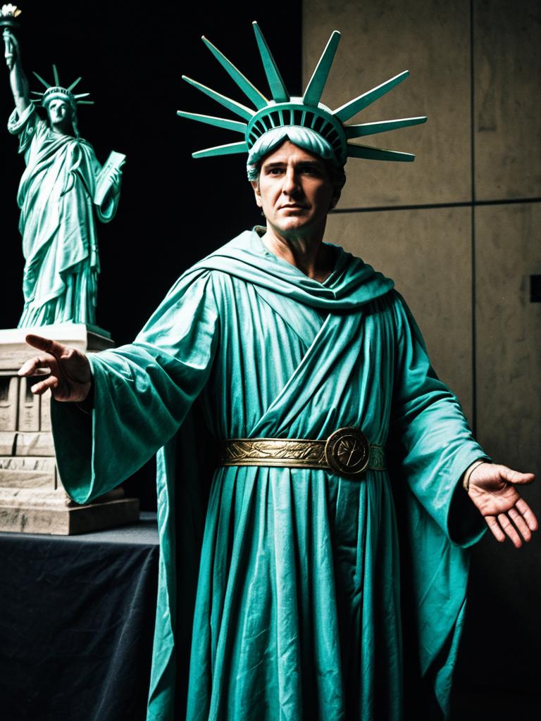 Portrait of a man wearing a detailed Statue of Liberty costume including a teal robe, golden belt, and crown with spikes, standing next to a small replica of the Statue of Liberty. The setting appears to be indoors with dramatic lighting emphasizing the costume's texture and facial expression.