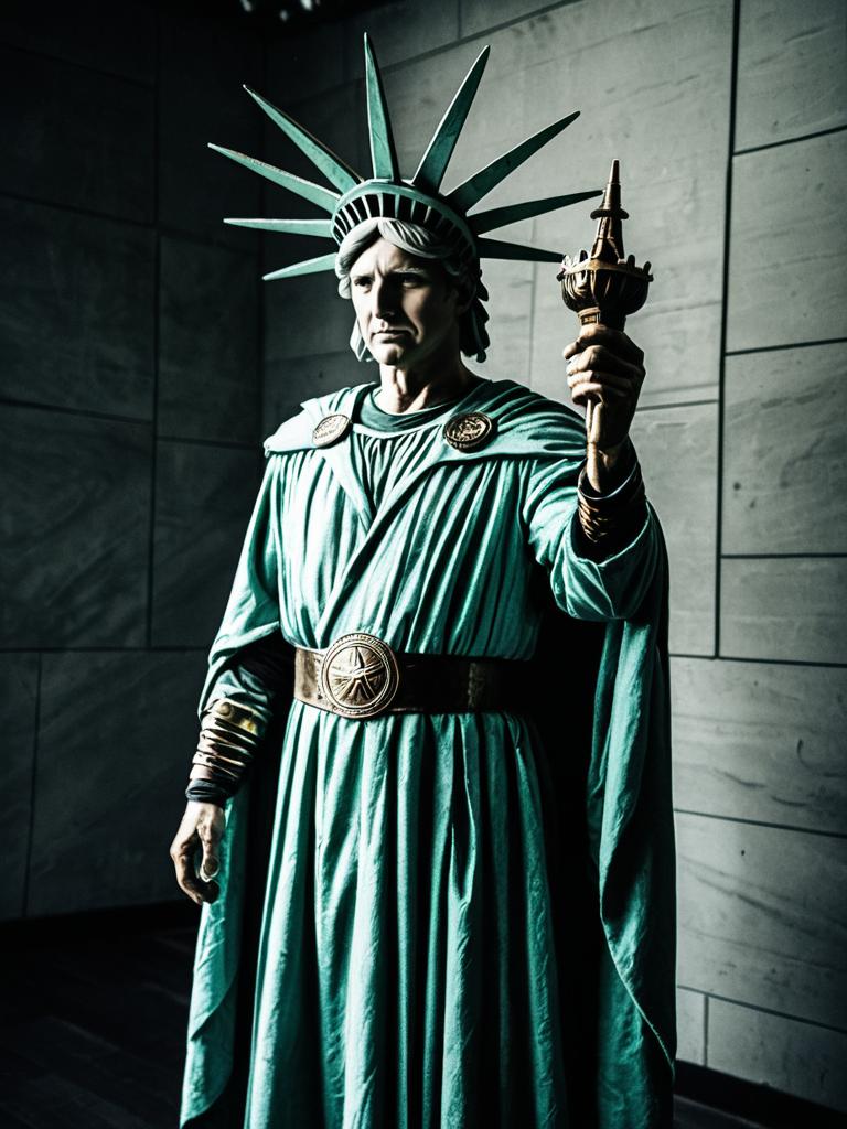 Man in Statue Liberty Costume, dramatic studio cosplay photo