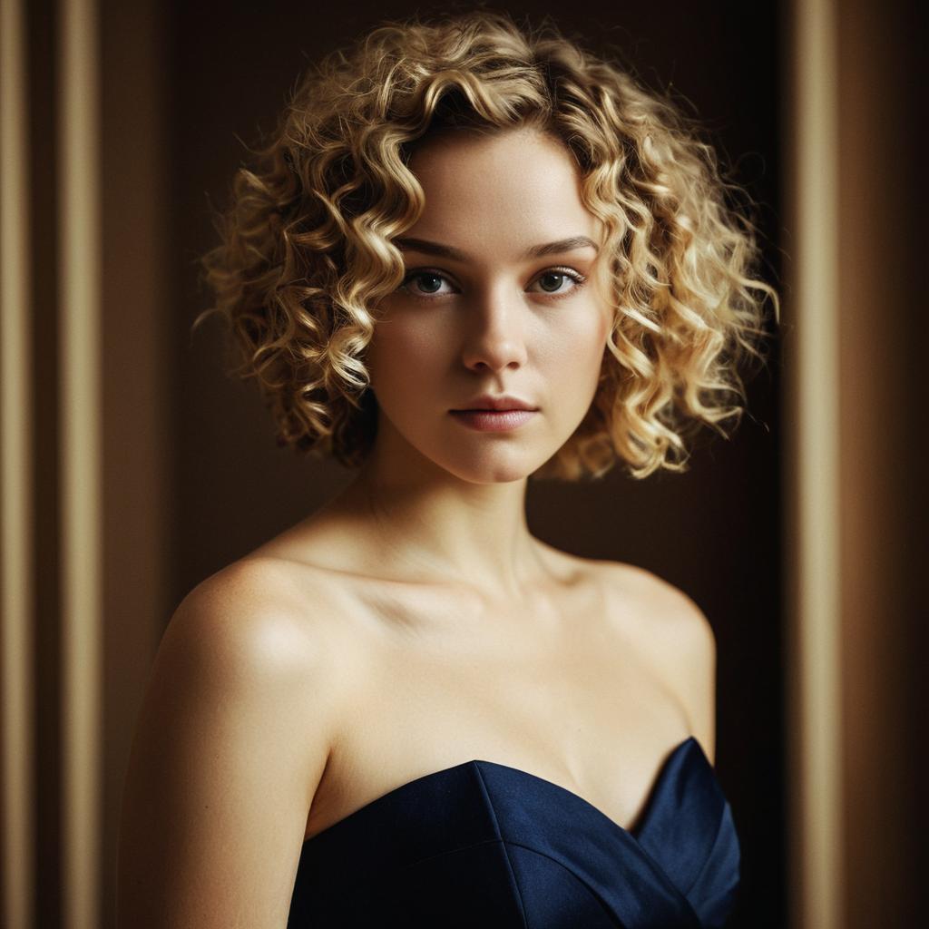 A realistic portrait of a young woman with short curly blonde hair and striking eyes, wearing a strapless navy blue evening dress, dramatic lighting accentuating smooth skin texture, warm brown and beige colors, detailed facial features, abstract blurred background