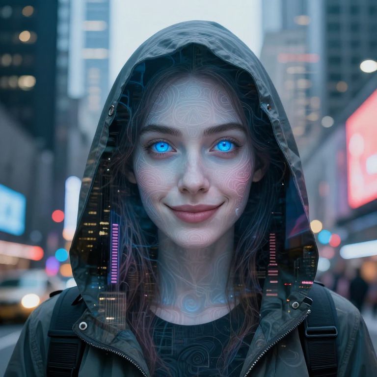 Digital art of a smiling woman with glowing blue eyes, wearing a hooded jacket, set against a bustling city street backdrop.