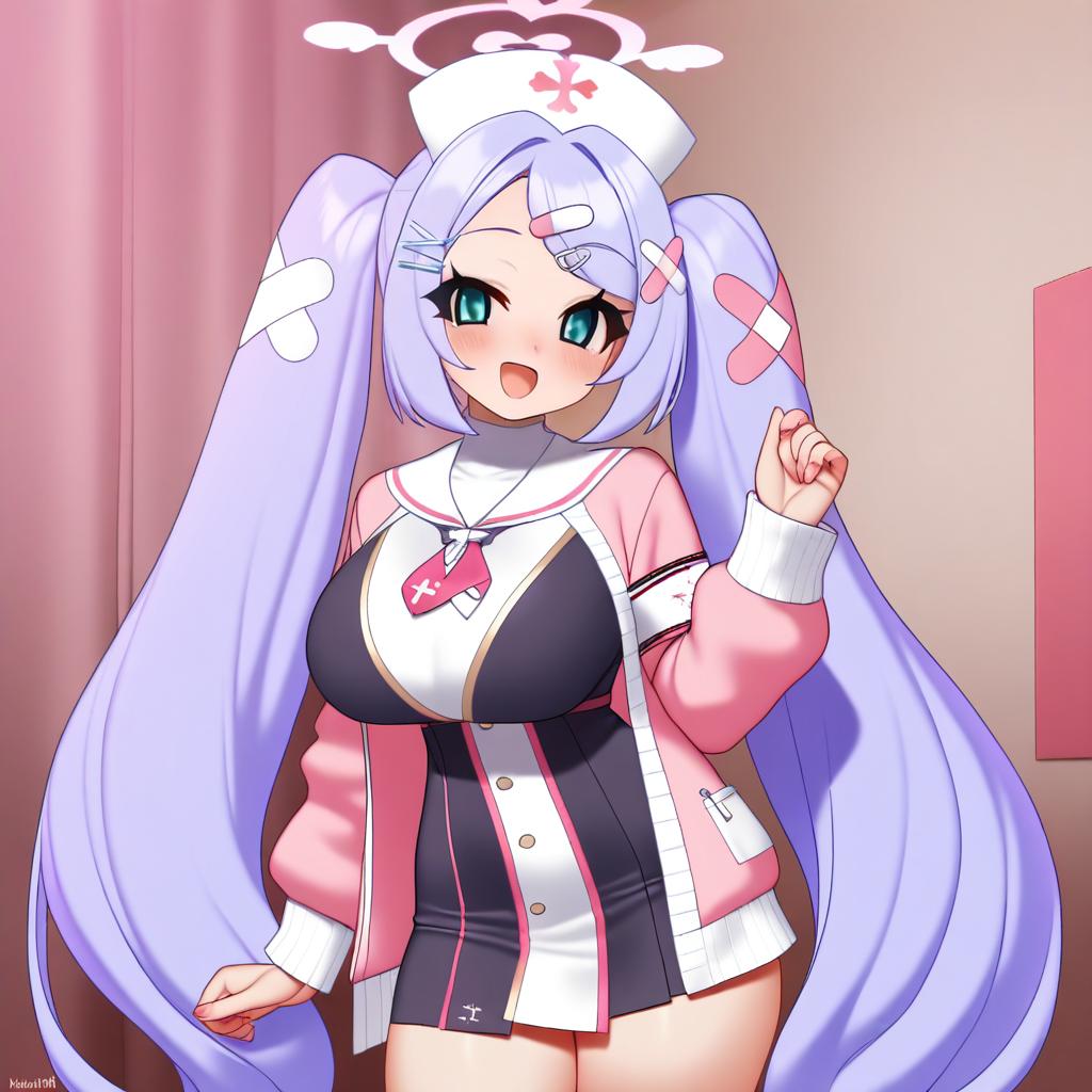 Hanae (blue archive), blue archive, 1girl, skin fang, blue eyes, purple hair, very long hair, long hair, bandaid hair ornament, twintails, hairclip, large breasts, nurse cap, halo, pink halo, long sleeves, by artist kuroonehalf, animagine