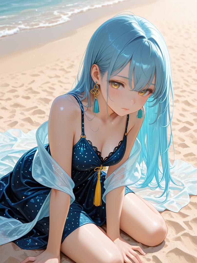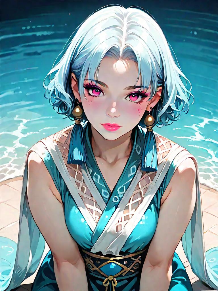 Digital artwork of an anime-style girl with short white hair and bright pink eyes, wearing a blue dress featuring bold geometric designs and a triangular crochet top. She has tassel earrings and a flowing beach shawl, seated at the edge of a pool with water in the background. The dress highlights deep ocean blue tones and features durable acrylic blend fabric. The setting suggests a modern chic poolside lounging atmosphere.