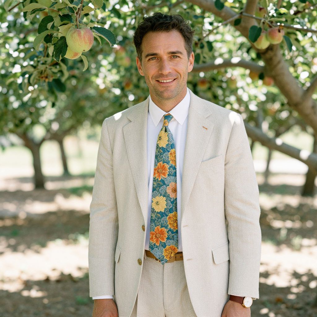 "a man, beige seersucker suit, white cotton dress shirt, vibrant floral tie, light brown suede loafers, matching brown leather strap watch, sun-dappled rows, ripe apples hanging, gentle breeze rustling leaves, kodak sp analog photo, relaxed smile, warm and inviting expression. Man has masculine face and piercing eyes"