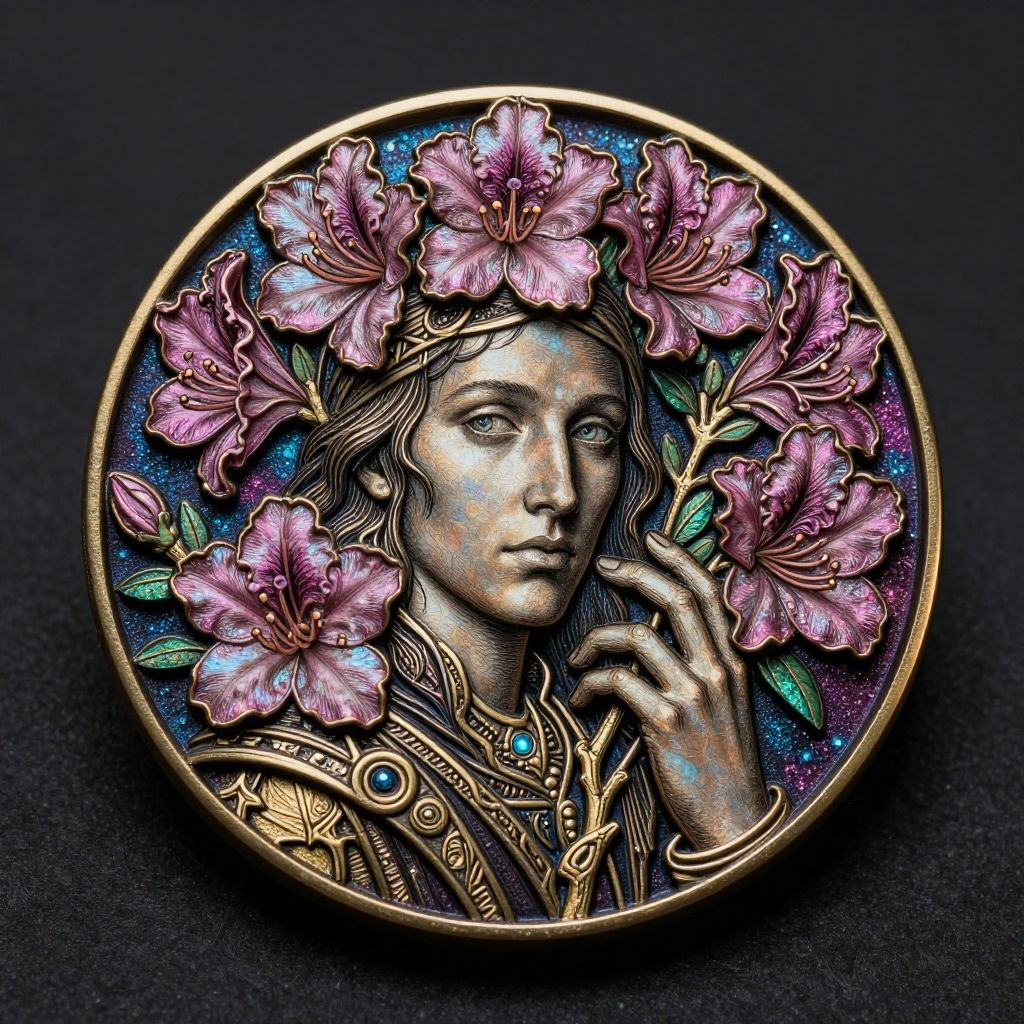 This is a photograph of a detailed, circular, bronze brooch featuring a highly intricate, relief-style engraving. The central figure is a serene, classical woman with wavy hair, adorned with a crown of vibrant pink flowers. Her hand is gracefully raised to her face. The background is a shimmering blend of blue and green hues, enhancing the flowers' vivid pink petals. The woman's attire is ornate, with patterns and a gemstone at the neckline. The brooch has a polished, golden border, contrasting with the dark, textured background, highlighting its intricate craftsmanship.