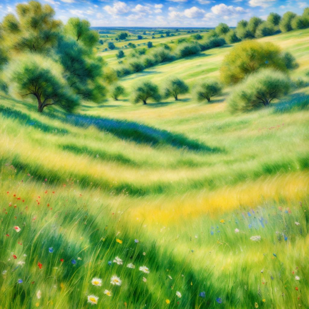 Tulip fields in Paul Cézanne's post-impressionist style, earthy browns and vibrant green, textured brushwork, rugged hillside, blooming flowers, high quality