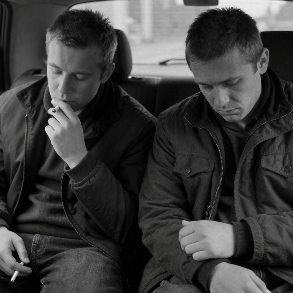 Black and white photograph of two men sitting close together. Both have short, unkempt hair and wear dark jackets. The man on the left holds a cigarette, eyes closed. The man on the right looks down, holding his jacket's cuff. Background includes a car seat. Both men appear tired and somber.