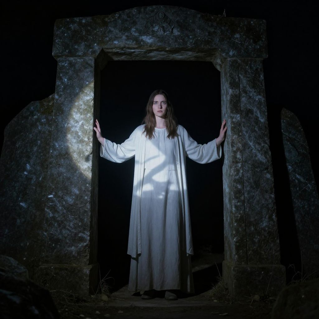 Photograph of a young woman with light skin and long, straight blonde hair standing in a dark, rocky doorway. She wears a white, flowing robe that contrasts with the shadowy background. Her arms are extended, palms pressing against the rough, textured stone frame. The robe is illuminated by a bright light source from the front, casting dramatic shadows. The background is mostly black, emphasizing the woman's white attire and the detailed texture of the stone. The overall mood is mysterious and slightly eerie.