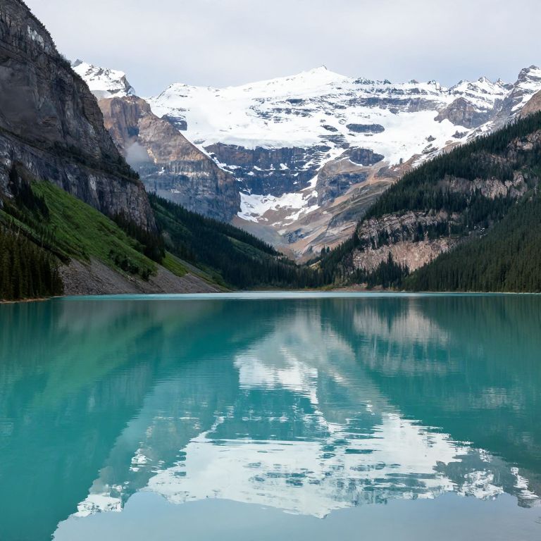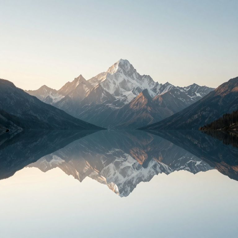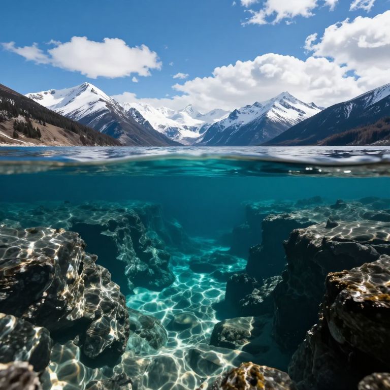 Above the tranquil surface of a crystal-clear lake, majestic snow-capped mountains rise against a vibrant blue sky dotted with fluffy white clouds, while beneath the water, a labyrinth of rocky caverns stretches into the depths, revealing a serene underwater world where sunlight filters through the azure expanse, casting a mesmerizing glow on the rugged stone formations.