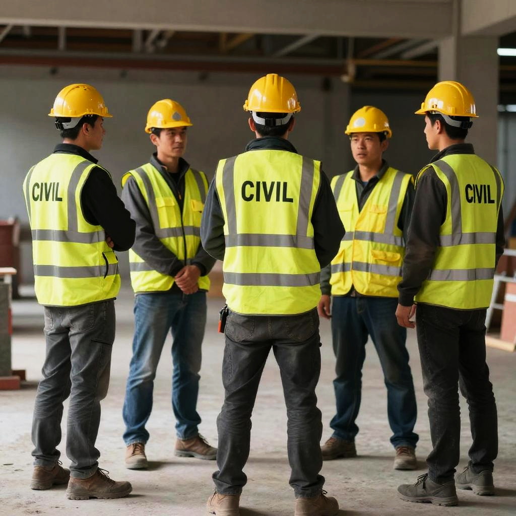 Photograph of five construction workers standing with their backs to the camera in a dimly lit indoor space. They wear yellow high-visibility vests labeled "CIVIL," yellow hard hats, and dark pants. Three workers are on the left and right, while two are in the middle. The ground is gray and the background is blurry with industrial elements.