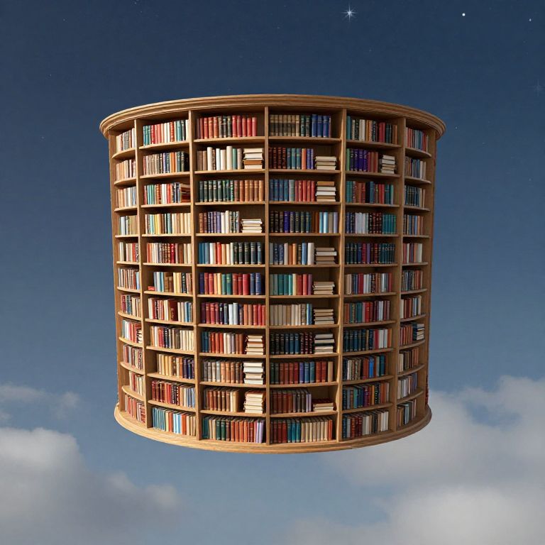 A floating library of boundless books drifts lazily across a sky where stars whisper forgotten languages into the wind.