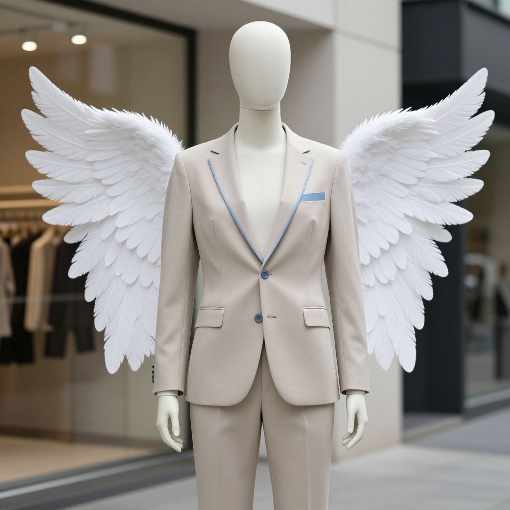 A mannequin standing upright in a modern storefront, wearing a well-tailored beige suit with subtle blue accents on the lapels and buttons, complete with white, elegant feathered wings that gently extend from its shoulders, giving it a sleek and slightly surreal, fashion-forward appearance. The mannequin has a neutral, lifelike facial expression with a calm, poised demeanor, rendered in high detail with soft lighting and realistic fabric textures, set in a minimalist, urban environment with soft shadows and ambient daylight.