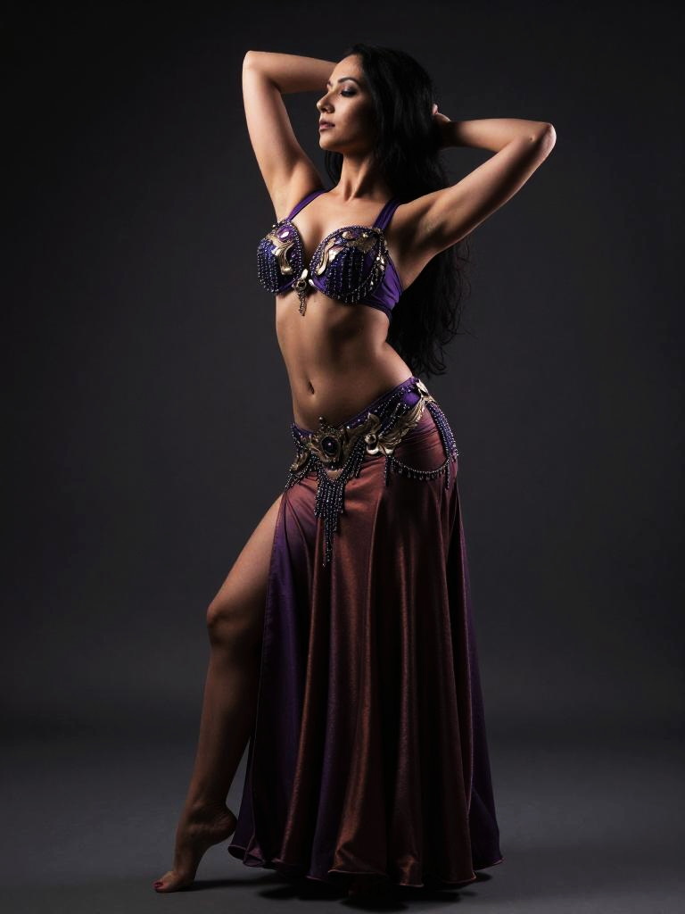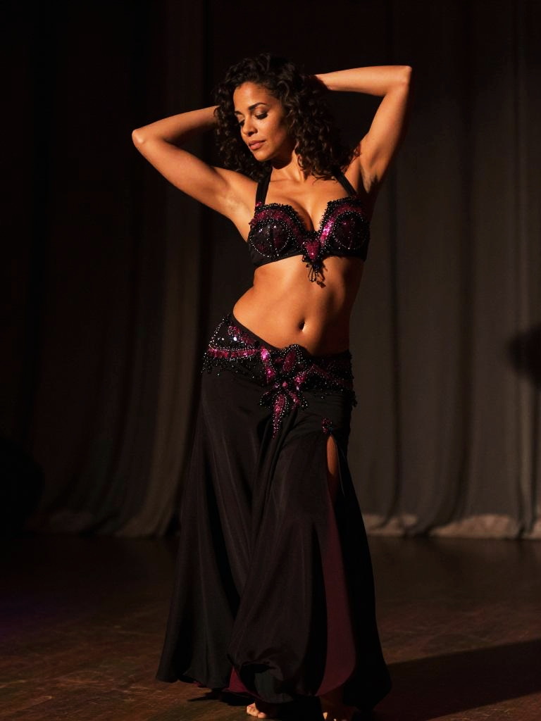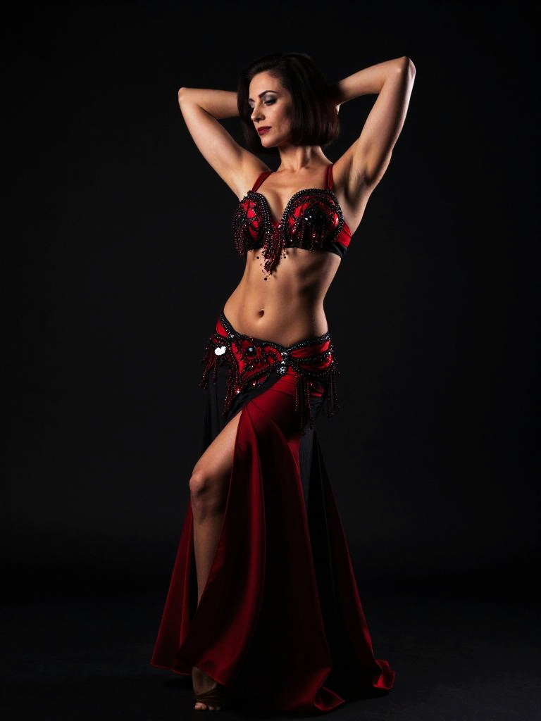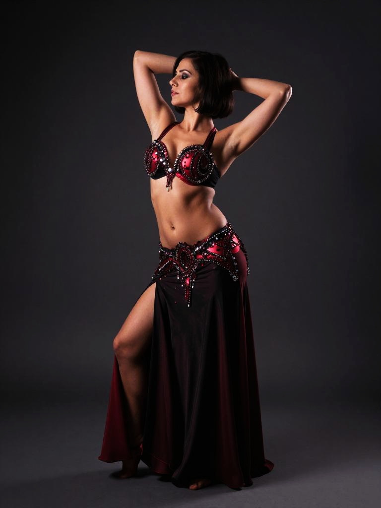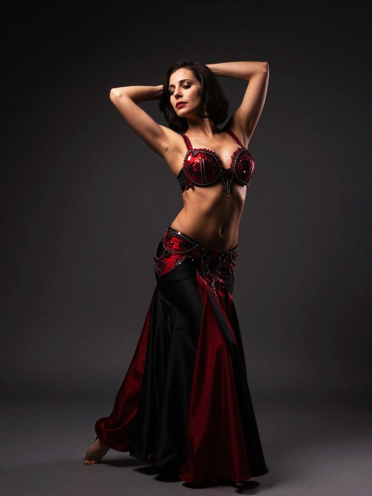 Belly dance, full-body portrait of tan-skinned woman with wavy chestnut hair in an ornate belly dance costume, standing in profile with one leg slightly bent, torso arched and both hands resting behind her head, long skirt falling in soft folds, subtle motion in the fabric, dramatic low key lighting, ruby red and black costume with shimmering beads and sequins, on a solid black studio background, high-end dance photography, sharp focus, rich contrast