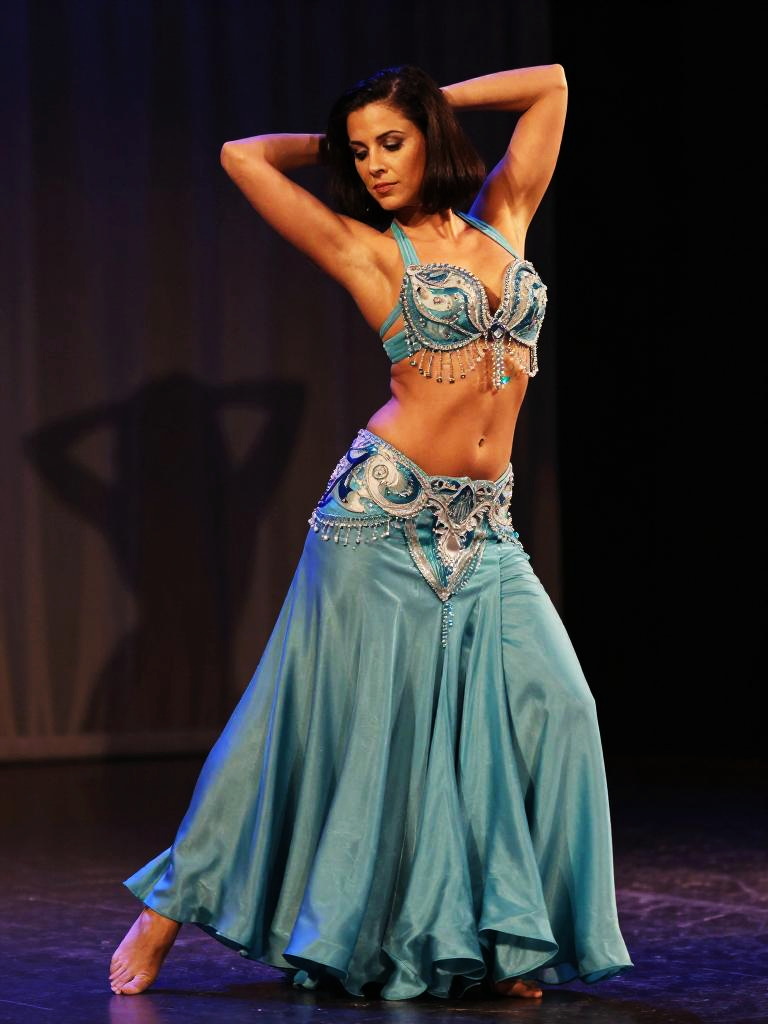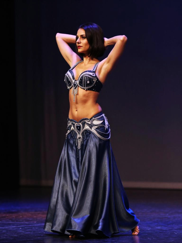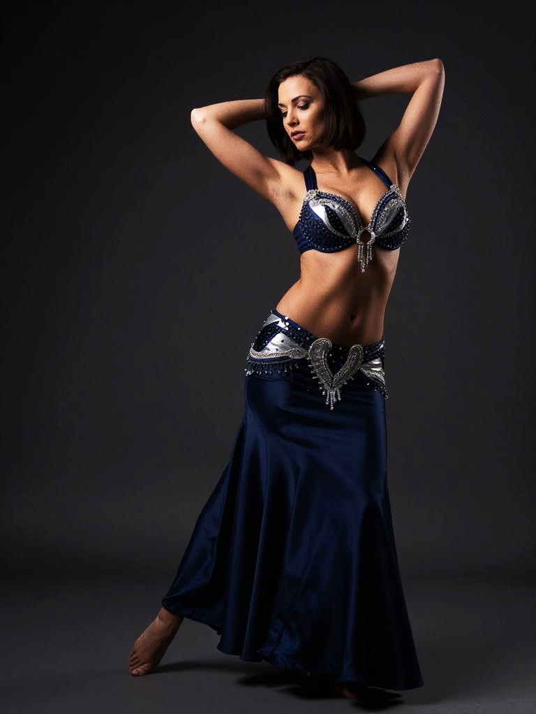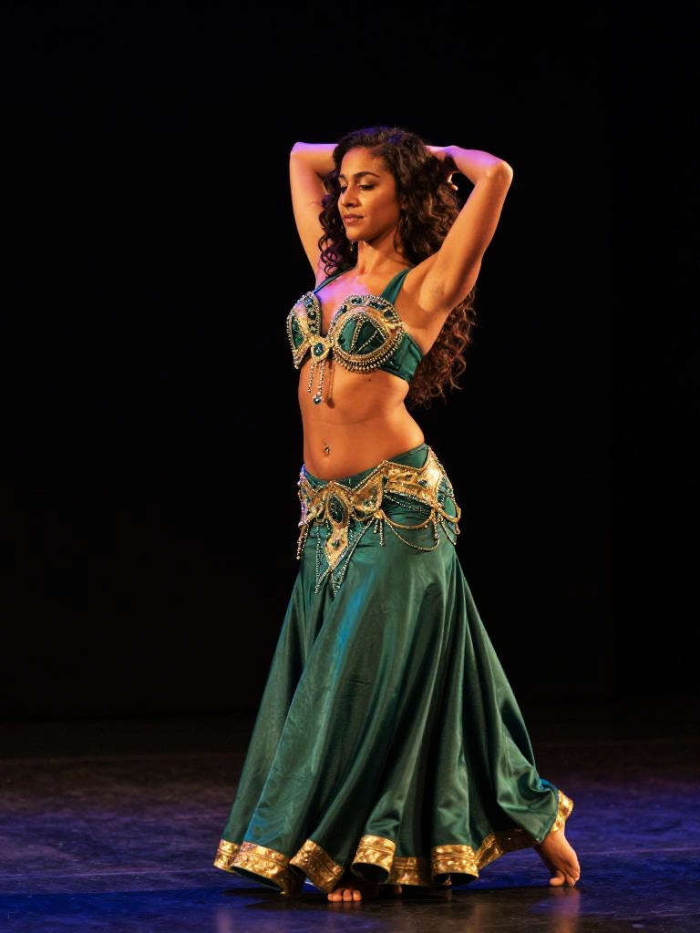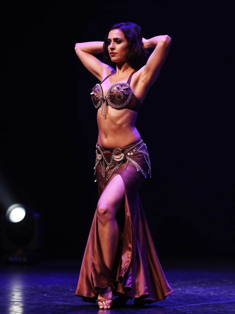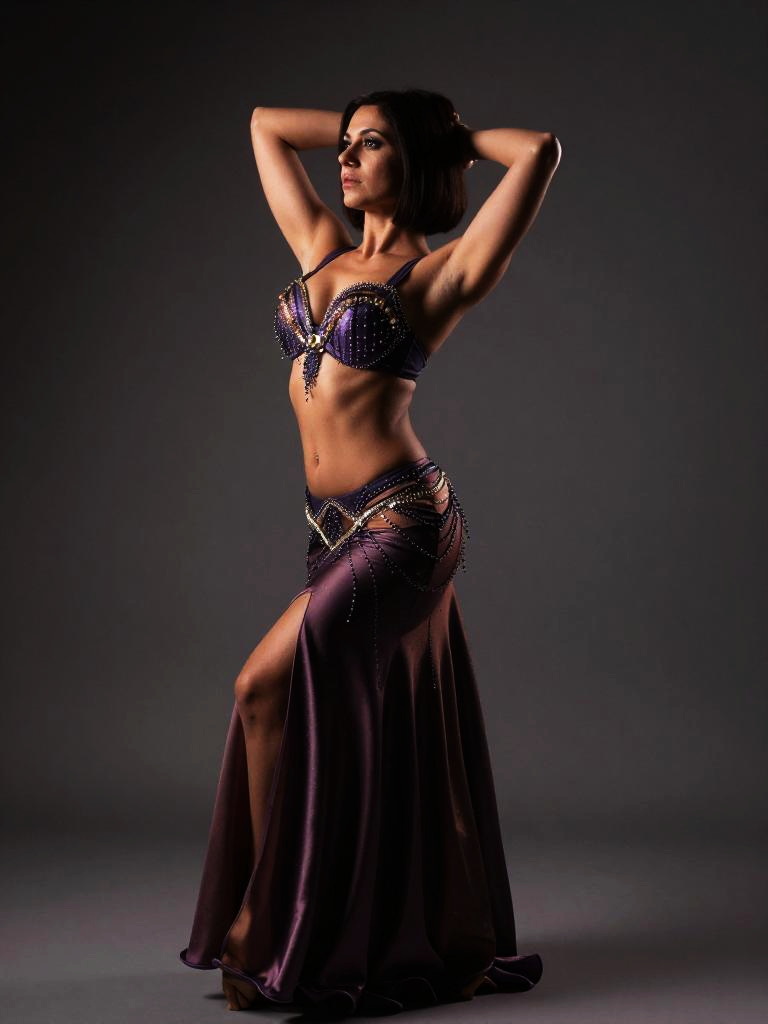 Belly dance, full-body portrait of tan-skinned woman with wavy chestnut hair in an ornate belly dance costume, standing in profile with one leg slightly bent, torso arched and both hands resting behind her head, long skirt falling in soft folds, subtle motion in the fabric, dramatic low key lighting, ruby red and black costume with shimmering beads and sequins, on a solid black studio background, high-end dance photography, sharp focus, rich contrast