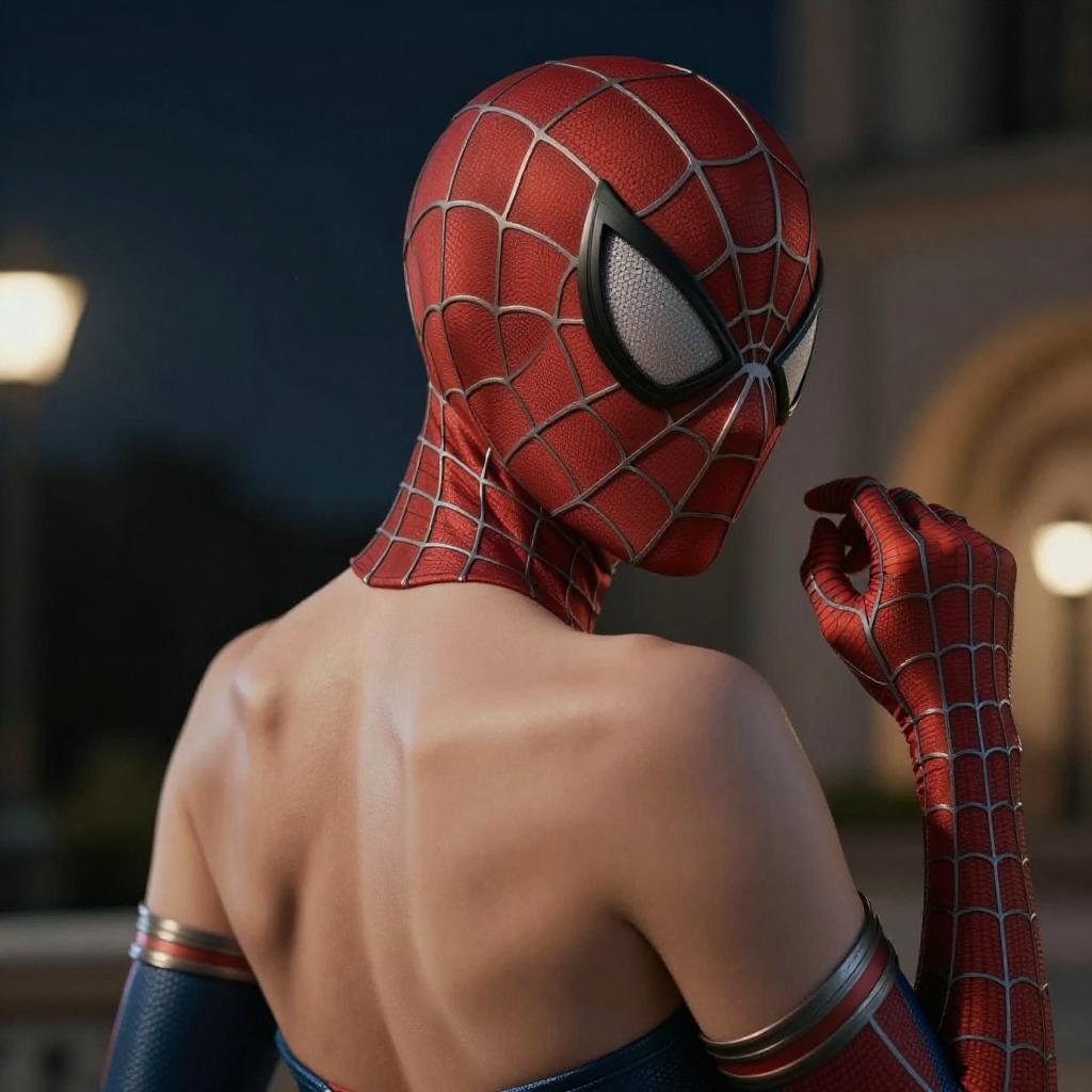 Woman posing for a photo, (back_view, photo from behind, looking_at_viewer:1.3), (wearing spiderwoman_cosplay_outfit:1.3), good hand, 4k, high-res, masterpiece, best quality, head:1.3, ((Hasselblad photography)), finely detailed skin, sharp focus, (cinematic lighting), collarbone, night, soft lighting, dynamic angle, [:(detailed face:1.2):0.2], (((5 stars hotel))), outside