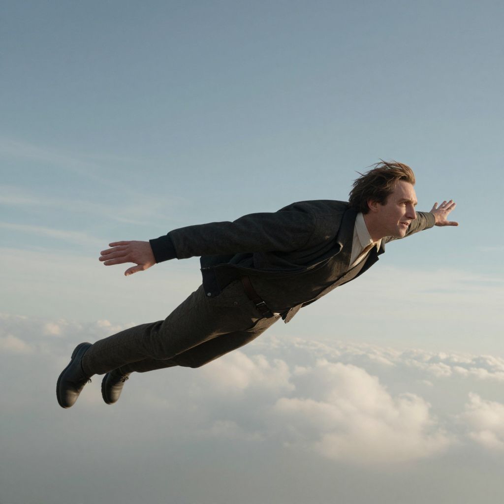 Photograph of a Caucasian man with short brown hair, wearing a dark suit, white shirt, and black shoes, flying mid-air against a clear blue sky with scattered white clouds. His arms are outstretched, and his facial expression is determined. The man's body is horizontally aligned, with his legs slightly bent and feet pointed downward. The sunlight casts a soft shadow beneath him, enhancing the sense of motion and elevation. The overall composition conveys a dreamlike, superhuman quality.