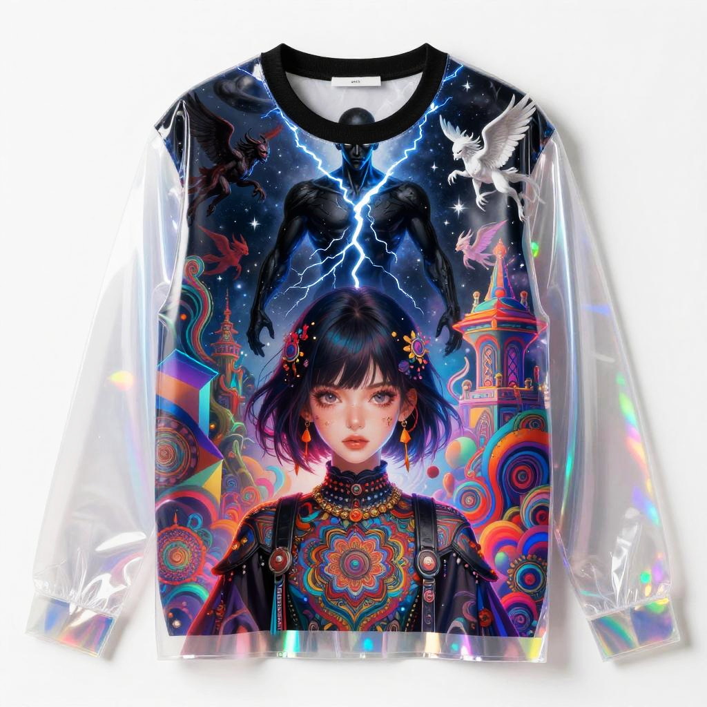 Transparent color PVC clothing, transparent color vinyl clothing, prismatic, holographic, chromatic aberration, fashion illustration, masterpiece, girl with harajuku fashion, looking at viewer, beautiful eyes, 8k, ultra detailed, pixiv, upper body, Divine lightning god, black man, black lightning god, in the middle of space, stars around him, demons and angels, 1 man, storm, impossible figures, paradoxical art, paradox, impossible geometry, hypercube, abstract fantasy castle, Beautiful Psychedelic Trippy Neon Intricate Detailed Elaborate, Art Peter Max, Android Jones Fantasy Art, Intricate Detailed Elaborate Colorful Flower Power Art, Fantasy Concept Art, Beautiful, Art Nouveau, Digital Painting, Matte Painting, Hyperrealism, Trending On Artstation, Hyperdetailed Ying yang of nature by Daniel Merriam, beautiful colors, floral, Joe Fenton and Android Jones, James Jean, Dan Mumford, depth of field, volumetric lighting maximalist photo illustration, photorealistic, hyperrealism, hyper realistic color photo, realistic photography ((hnsrdlf style)), dark atmosphere, gothic art, realistic blood, RTX graphic, HDR, ultra realistic shadows, ultra quality