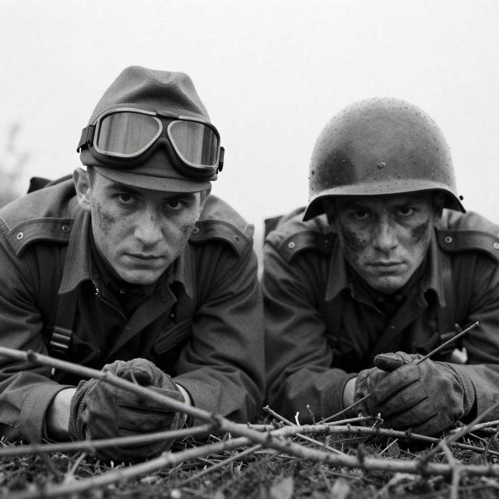 Black-and-white photograph of a soldier in a steel helmet, lying on the ground, holding a dark bottle in his right hand, with a determined expression. Background shows rough, sandy terrain. Soldier's left hand grips the ground, backpack visible on his back. Intense facial expression. Soldier's face shows wrinkles and focus.