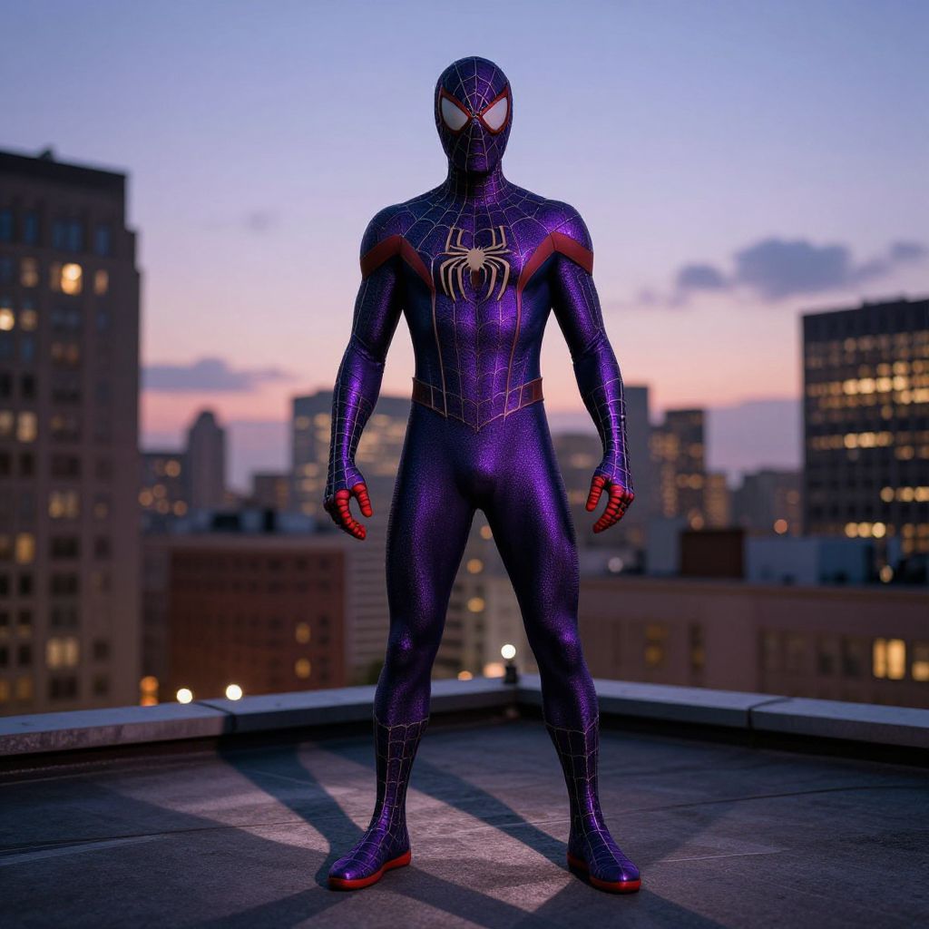 Purple Spider Man suit standing heroically on a rooftop overlooking the city skyline at twilight, the fabric shimmering with metallic purple and black highlights, soft wind effects and long shadows, detailed environment with skyscrapers and glowing windows.