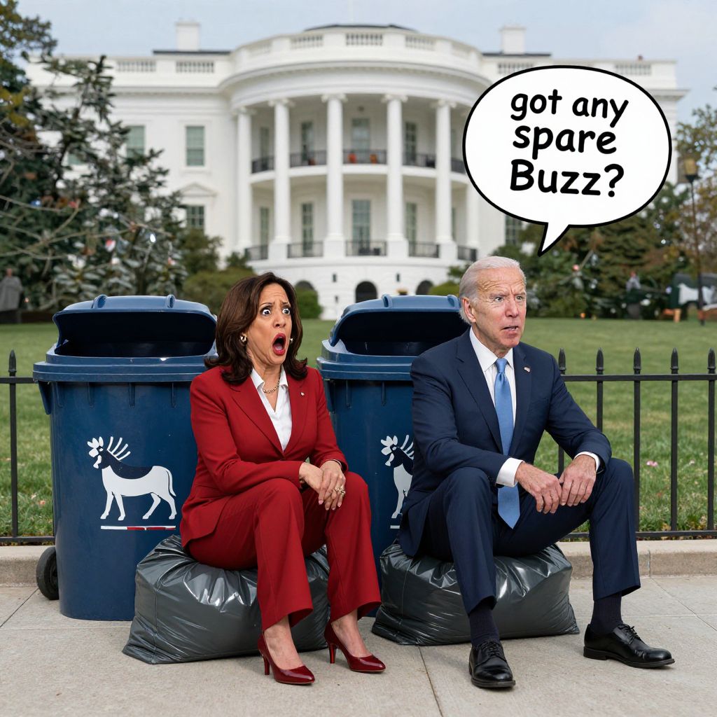 Kamala Harris and Joe Biden sit on trash bags on the sidewalk next to two trash bins in front of the white house, The Democrat donkey symbol adorns the side of the trash bins, Disappointment and shock on their faces, Speech bubble saying \"got any spare Buzz?\", In the style of Jack Ohman cartoons
