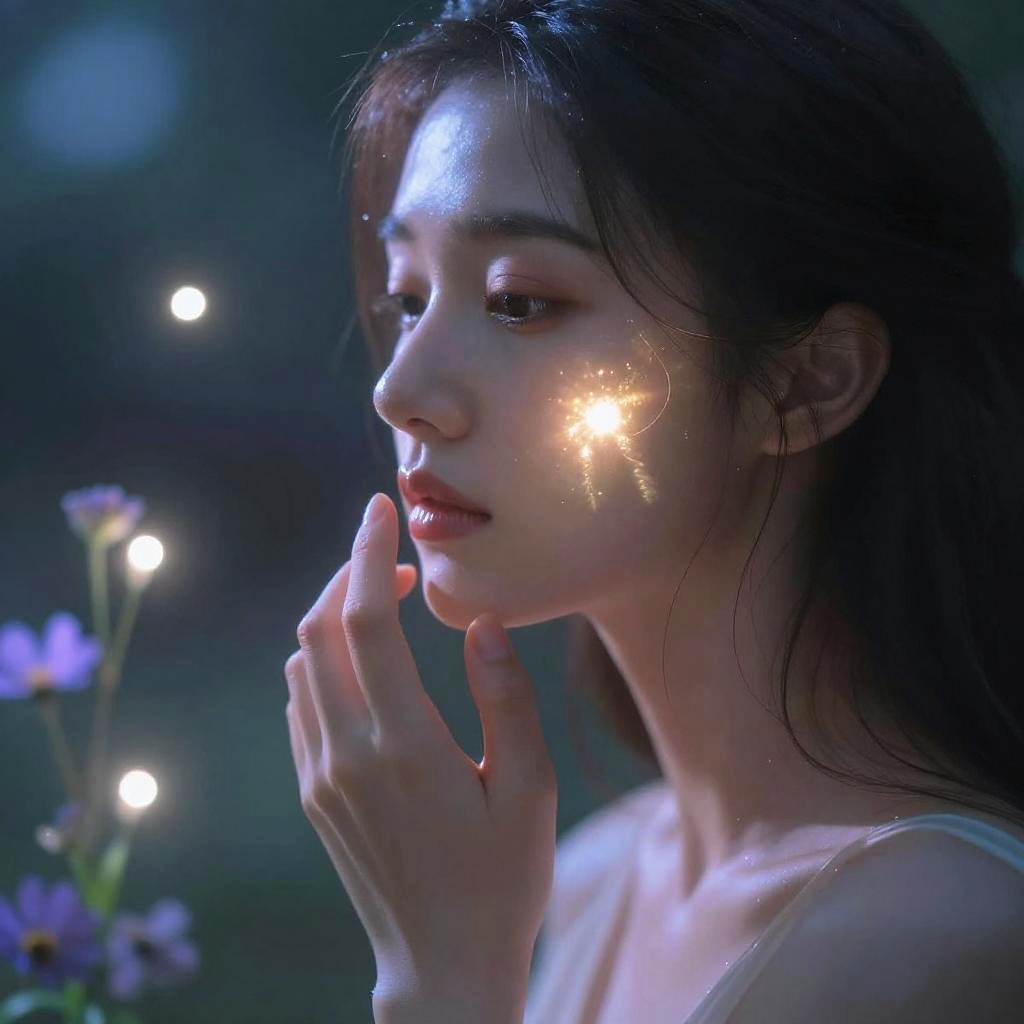 Caressing cheek in an ethereal dreamscape, finger tips glowing faintly while softly touching translucent skin, surrounded by floating light orbs and delicate flora, mystical and gentle ambiance with vibrant yet soothing color scheme, surreal and emotive composition.