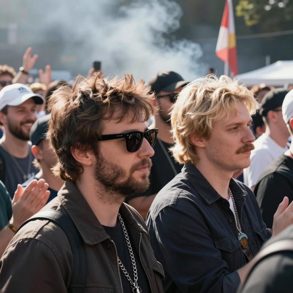 Two men in a crowded outdoor scene. The man on the left has messy brown hair, a beard, black sunglasses, a dark jacket, and a chainmail piece. The man on the right has blond hair, a mustache, a dark shirt, and looks to the side. Crowd in the background, some wearing hats, smiling and clapping. Bright sunlight, smoke, and flags in the background. Multiple people, casual clothing, dense crowd.