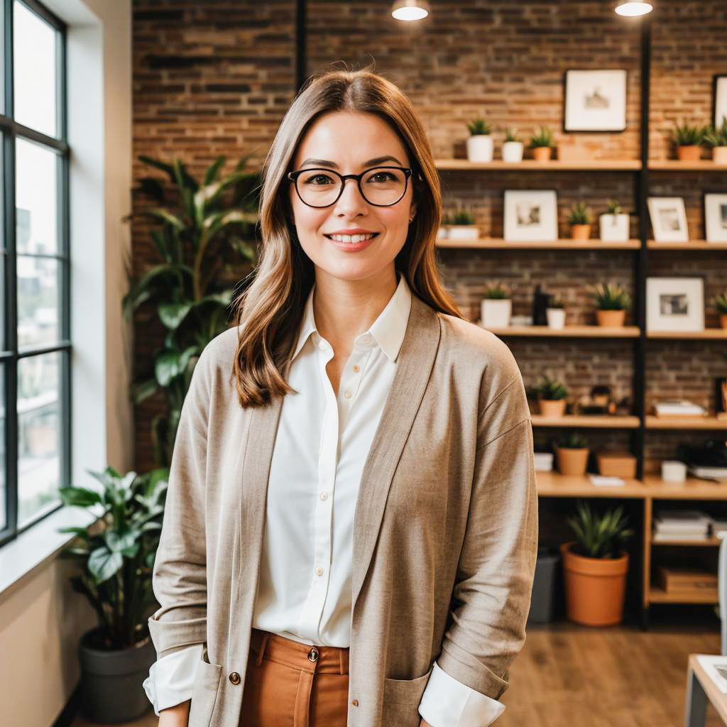 Portrait of a young woman with straight brown hair and glasses, dressed in a white shirt and beige cardigan paired with rust-colored pants, standing in a cozy coworking space with brick walls, shelving, and potted plants.