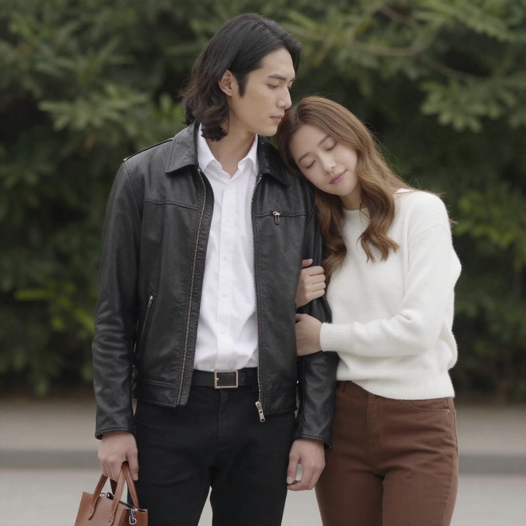 Photograph of a couple standing outdoors. The man with long, dark hair, wearing a black leather jacket over a white shirt and black pants, holds a brown bag in his left hand. The woman with light brown hair, wearing a white sweater and brown pants, leans into him with her eyes closed and arms around his waist. Dense greenery is in the blurred background.