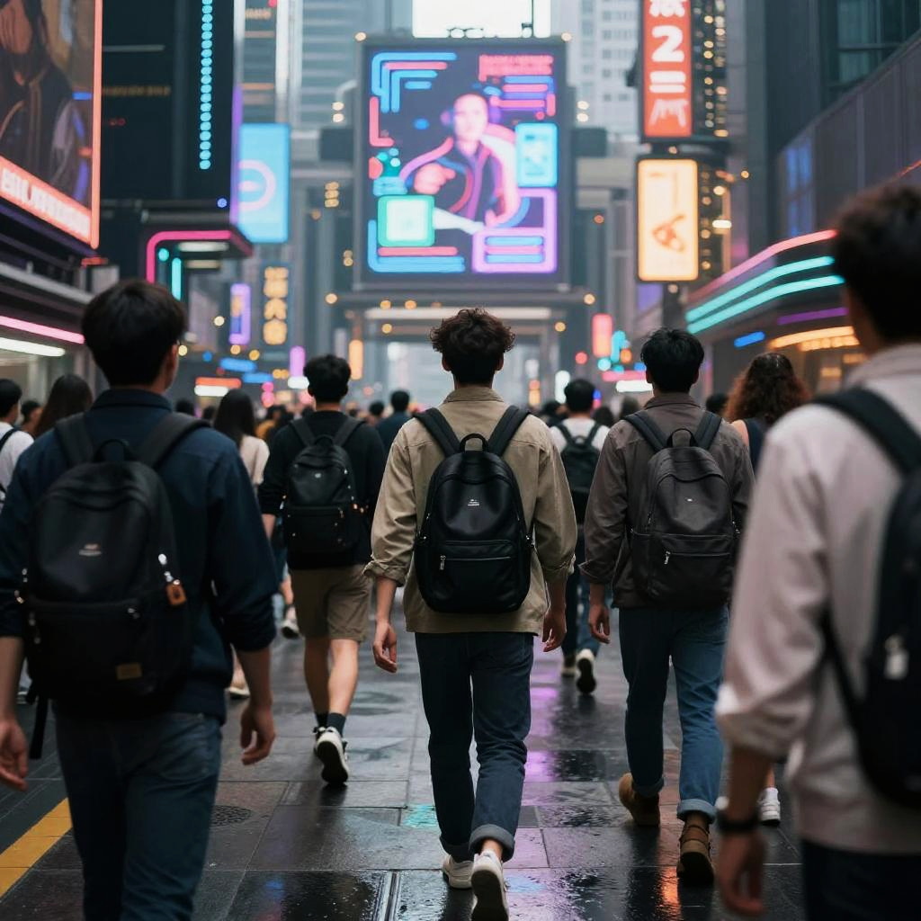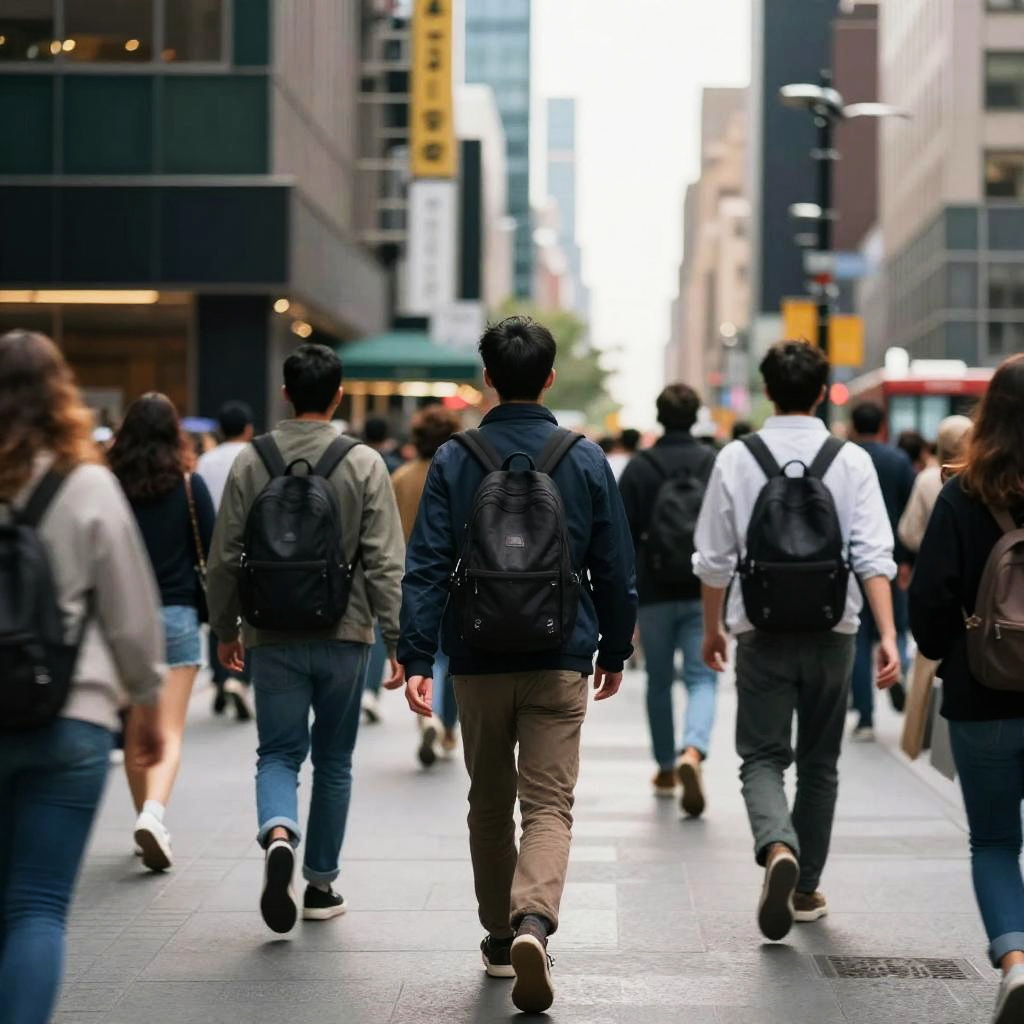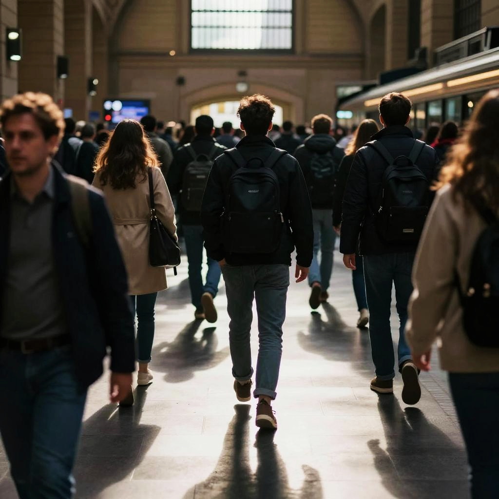 Walking against the crowd at a busy train station, solitary person in sharp focus standing out amid hurried commuters, dramatic lighting, high contrast, cinematic atmosphere