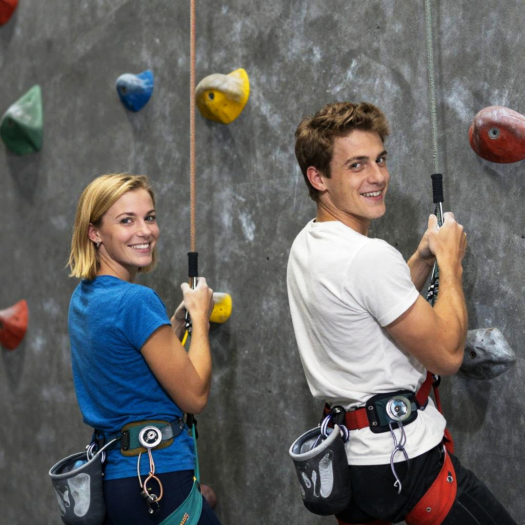 Photograph of an indoor rock climbing scene. Woman with light skin, short blonde hair, and a grey long-sleeve shirt climbs a dark rock wall. She has toned legs and is mid-jump. Two people with dark hair and wetsuits splash in the pool below. In the foreground, a black inflatable boat with equipment. Rock wall has green moss and ropes. Intense expressions on climbers' faces.