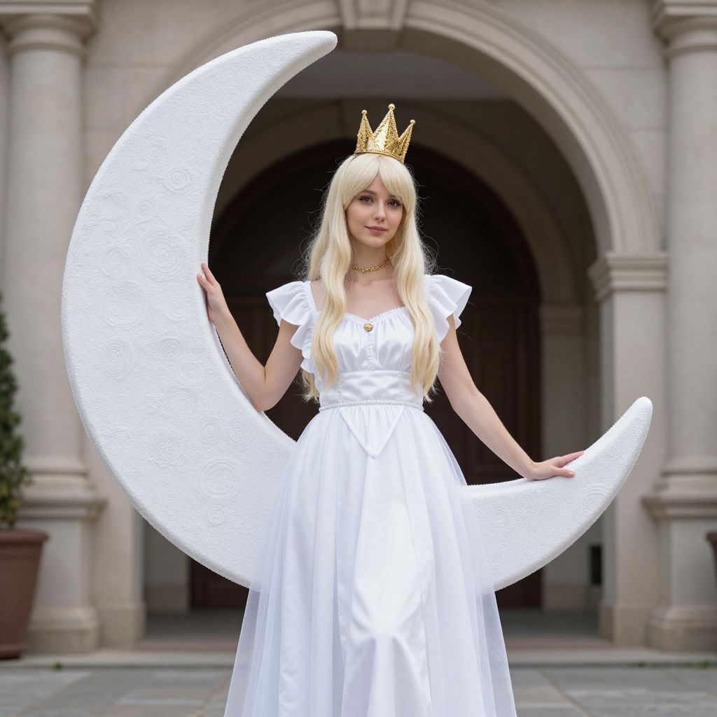 Moon Fairy Costume, dressed in a white dress and gold crown standing in front of a building