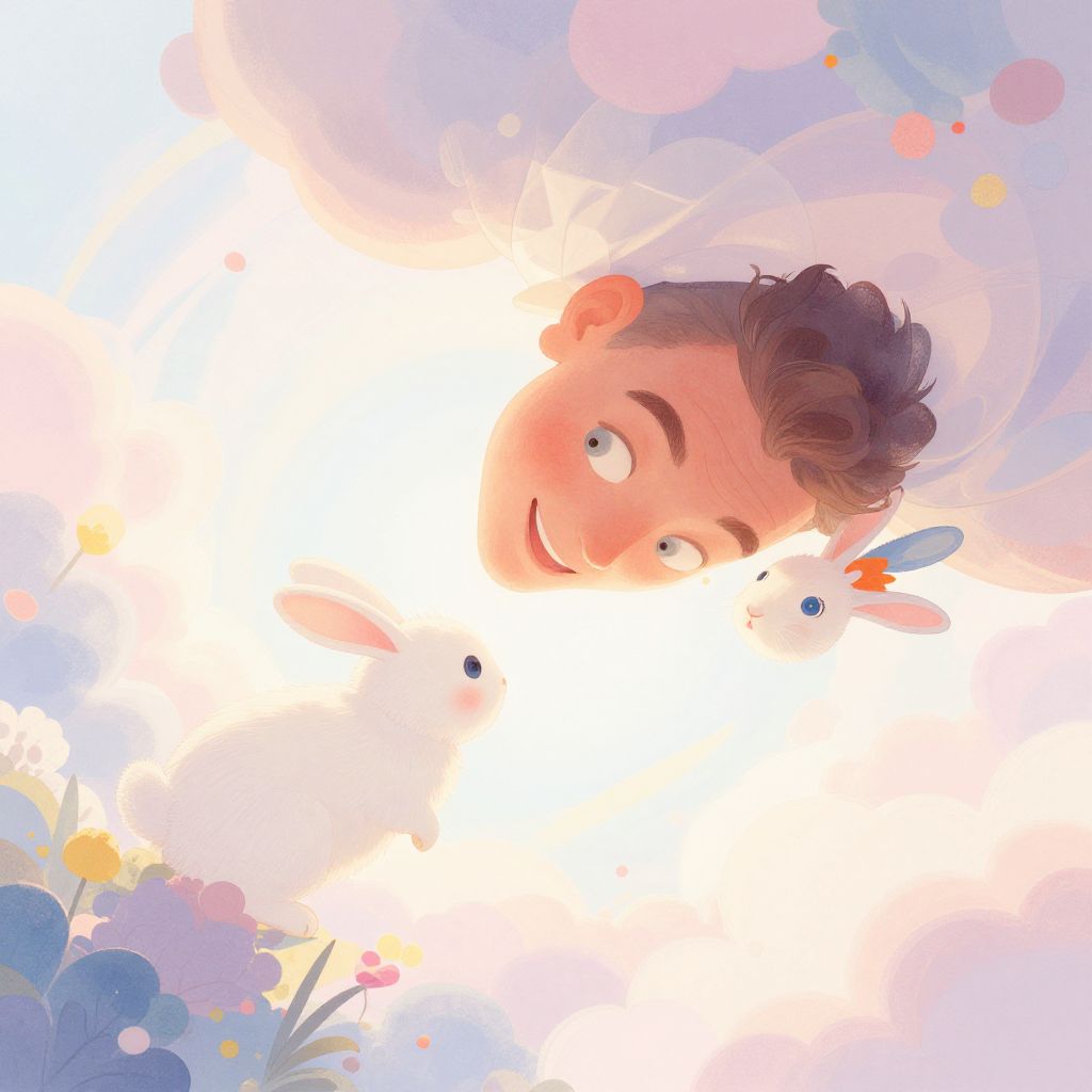Enchanting illustration of a man descending from above, amidst a dreamlike setting filled with fantastical creatures and flora, set against a backdrop of soft pastel colors, including pale pinks, blues, yellows, and whites. The subject's face radiates joy as he interacts playfully with a small, cute rabbit, its fur adorned with Man has masculine face and piercing eyes