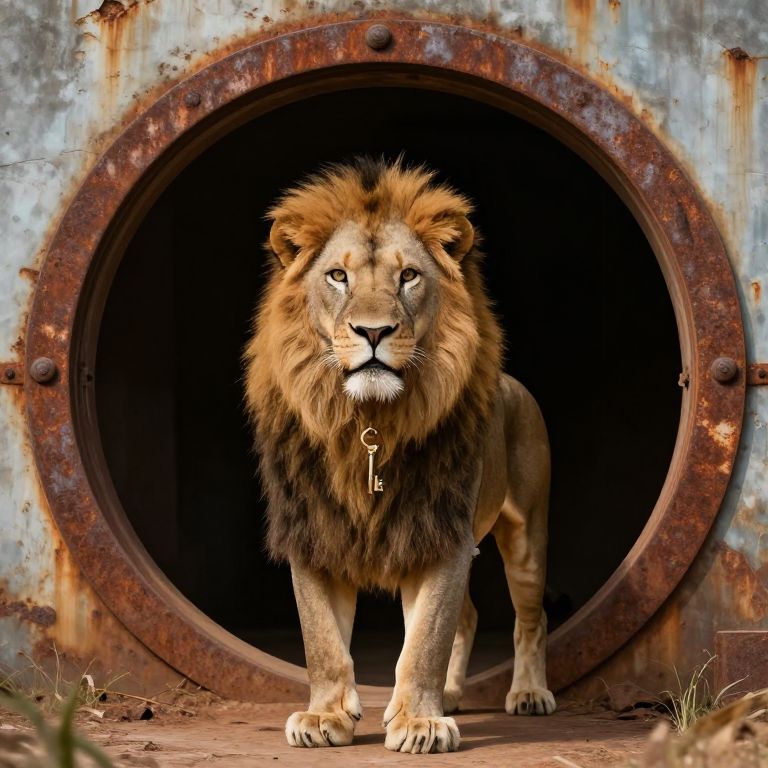 Photorealistic image of a majestic lion with a key in its mane, standing in a circular, rusted industrial doorway.
