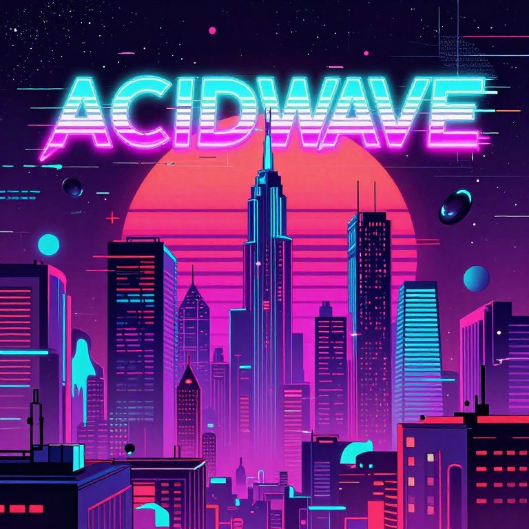 Acidwave aesthetic, vibrant neon colors, retro-futuristic cityscape, glitch effects, surreal synthwave vibes, melting shapes, digital decay, 80s cyberpunk inspiration, vaporwave fonts
