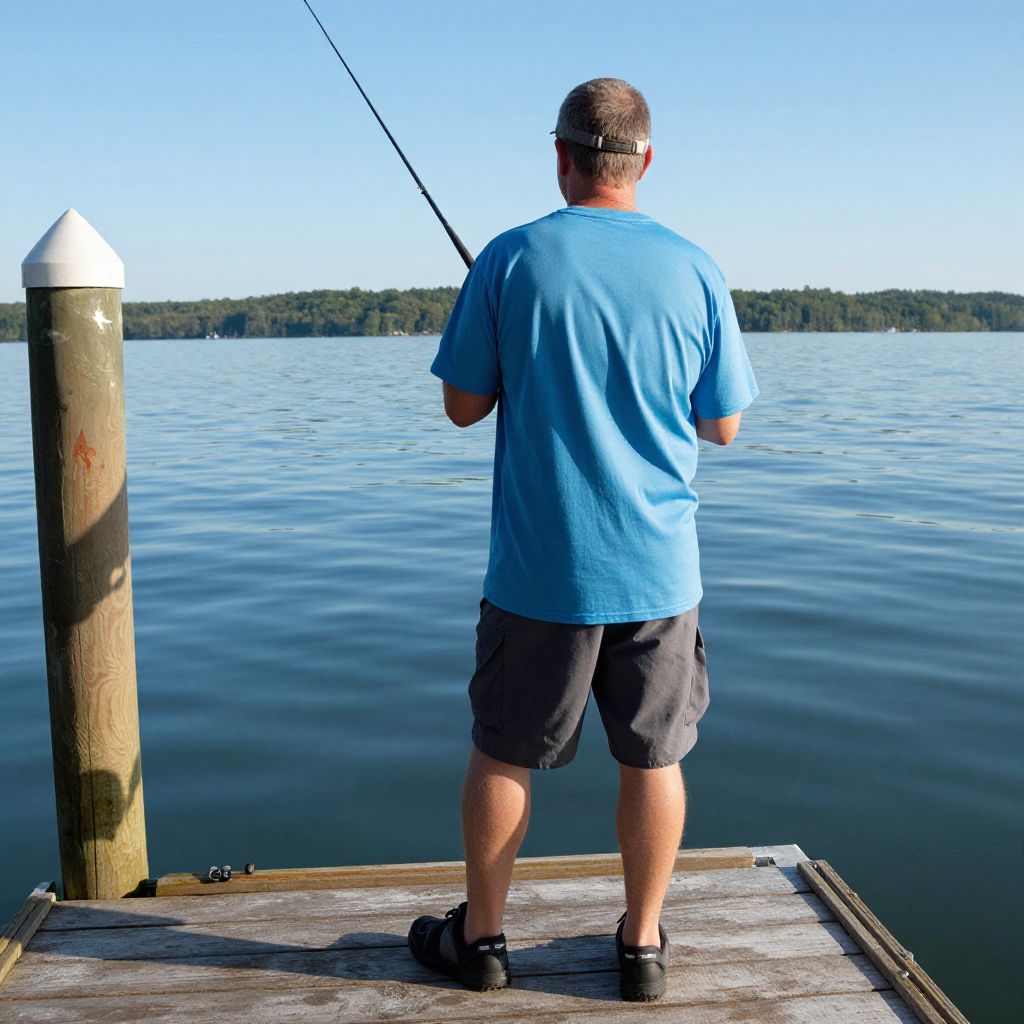 "Fishing Shirts Man, man standing on a dock with a fishing rod"