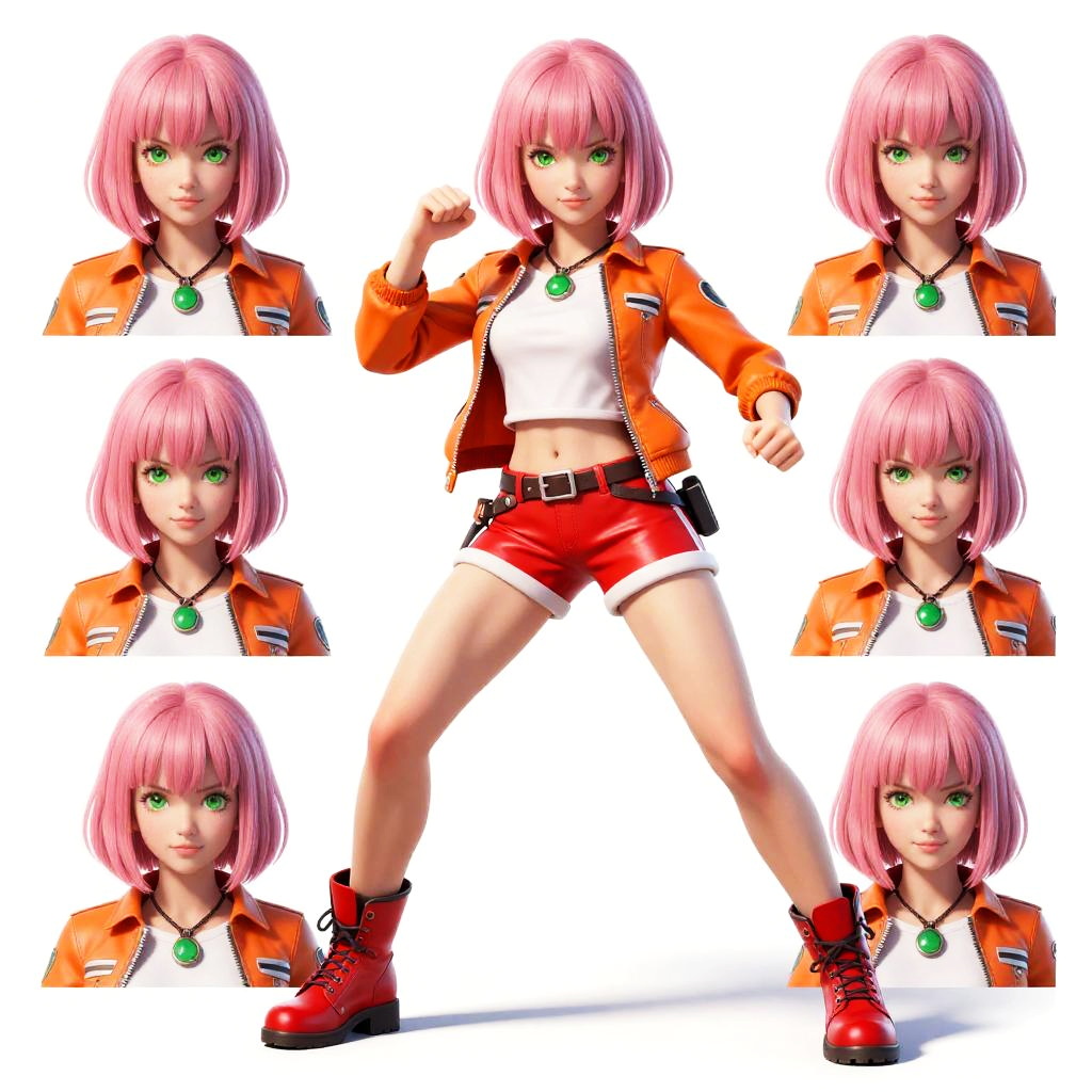 (CharacterSheet:1), 1girl, (pink short hair:1.3), (orange jacket, red shorts, bangs, white shirt, green pendant, red shoes, green eyes), fight pose, (multiple views, full body, upper body, reference sheet:1), (simple background, white background), (masterpiece:1.2), (best quality, highest quality), (ultra detailed), (8k, 4k, intricate), (full-body-shot), (Cowboy-shot:1.4), (50mm), (highly detailed:1.2), (detailed face:1.2), detailed_eyes, (gradients), (ambient light:1.3), (cinematic composition:1.3), (HDR:1), Accent Lighting, extremely detailed, original, highres, (perfect_anatomy:1.2)