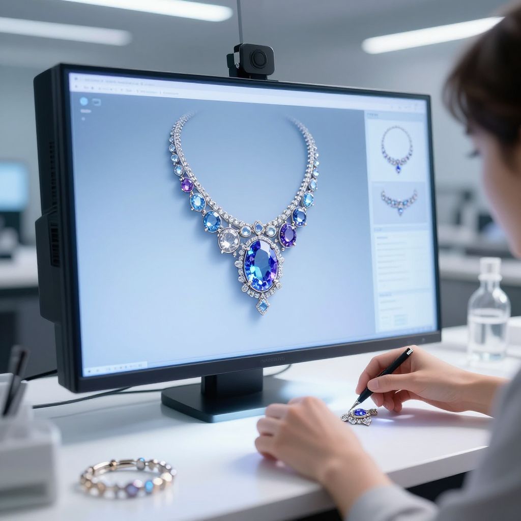 AI jewelry generator futuristic workshop, virtual reality interface showing customizable necklace and bracelet designs, shiny precious stones with intricate metalwork, ethereal blue and purple hues, clean, professional, highly detailed