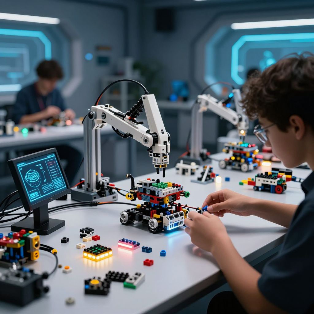 Futuristic AI Lego workshop, advanced LEGO robotics being assembled by AI-assisted machines, workbenches filled with small glowing bricks and digital interfaces, ambient sci-fi lighting, showcasing engineering precision and creative innovation, ultra-realistic visualization.