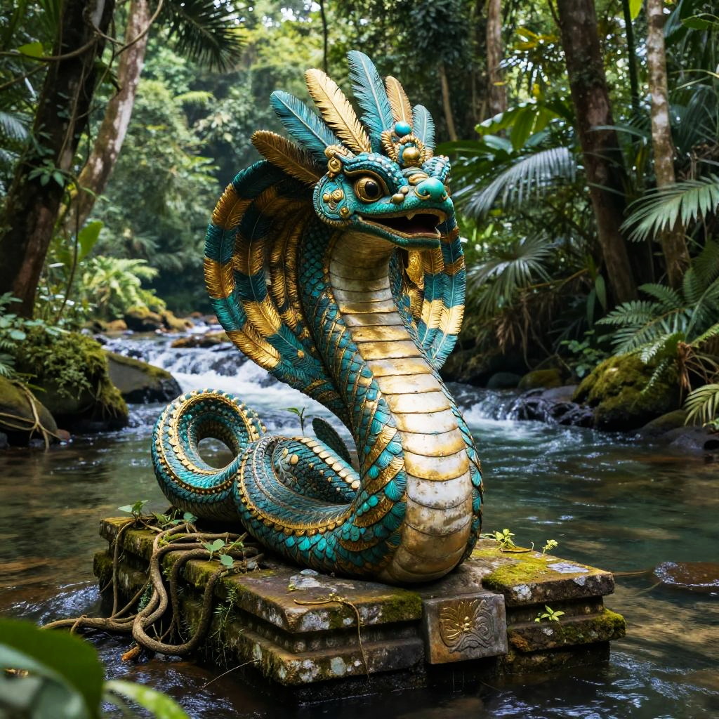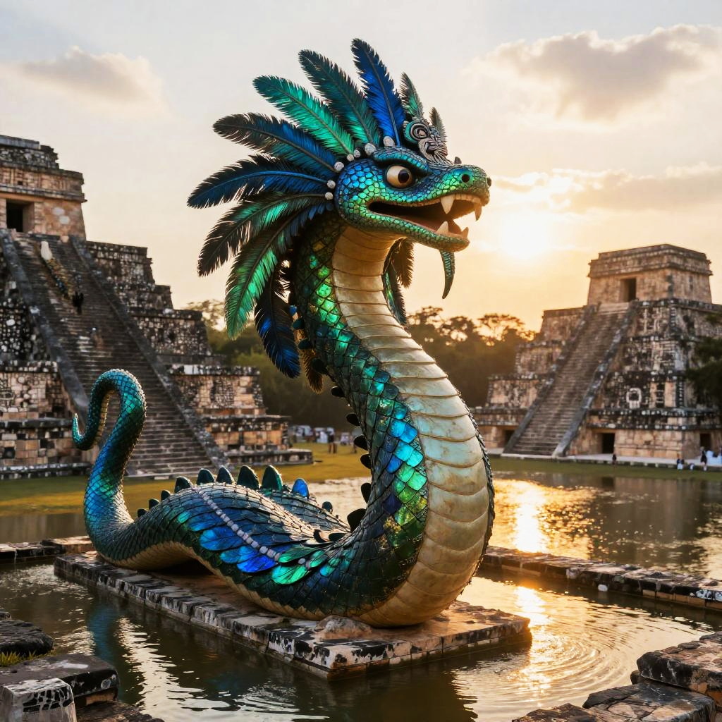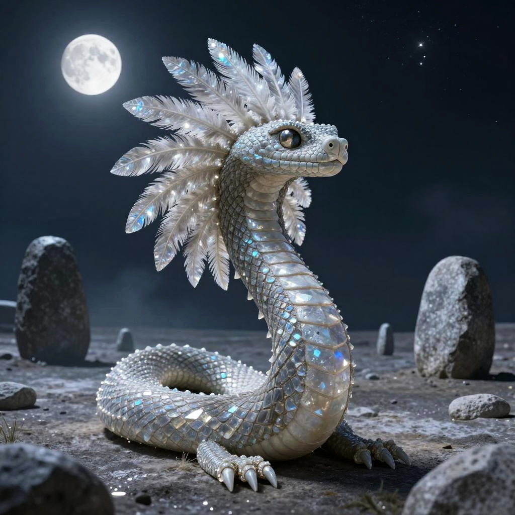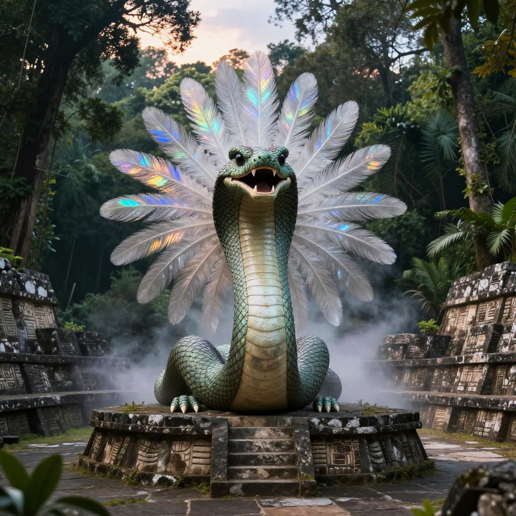 Kukulkan – Feathered serpent deity, depicted as a regal serpent spirit covered in silver feathers that gleam with ethereal luminescence, standing in a frozen tundra landscape dotted with crystalline ice formations and pale northern lights.
