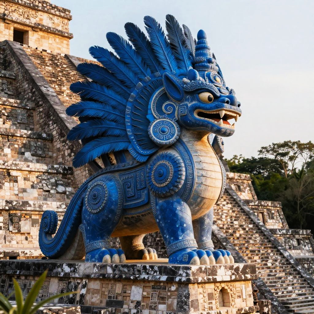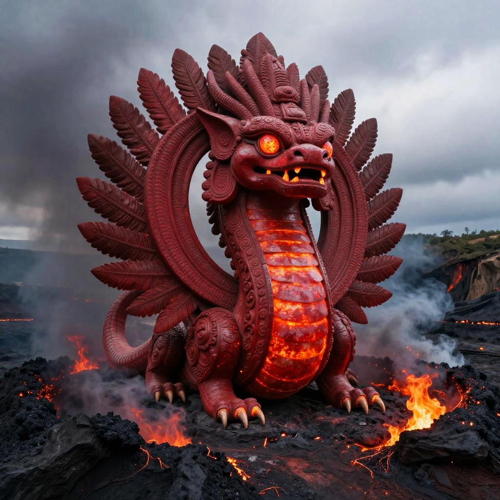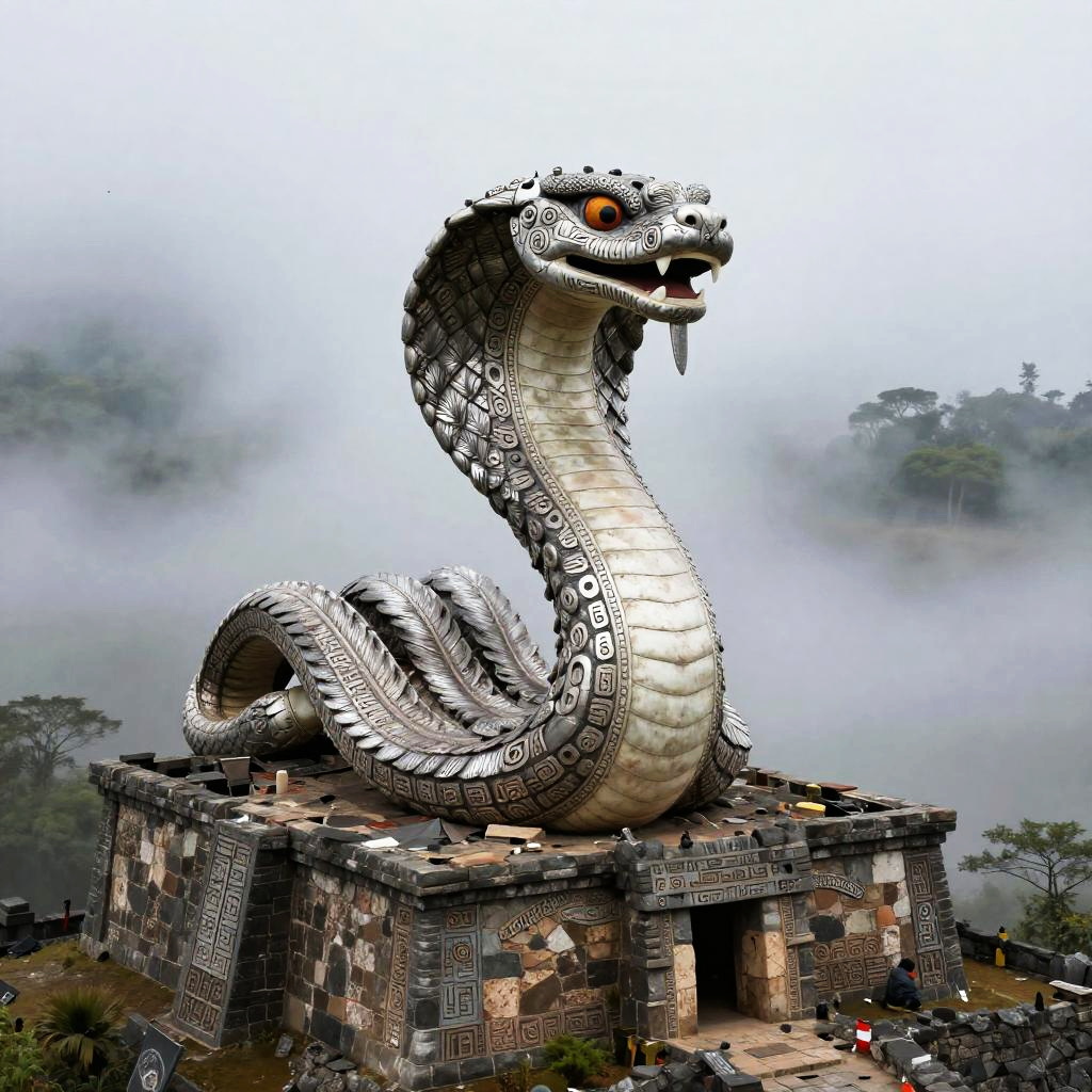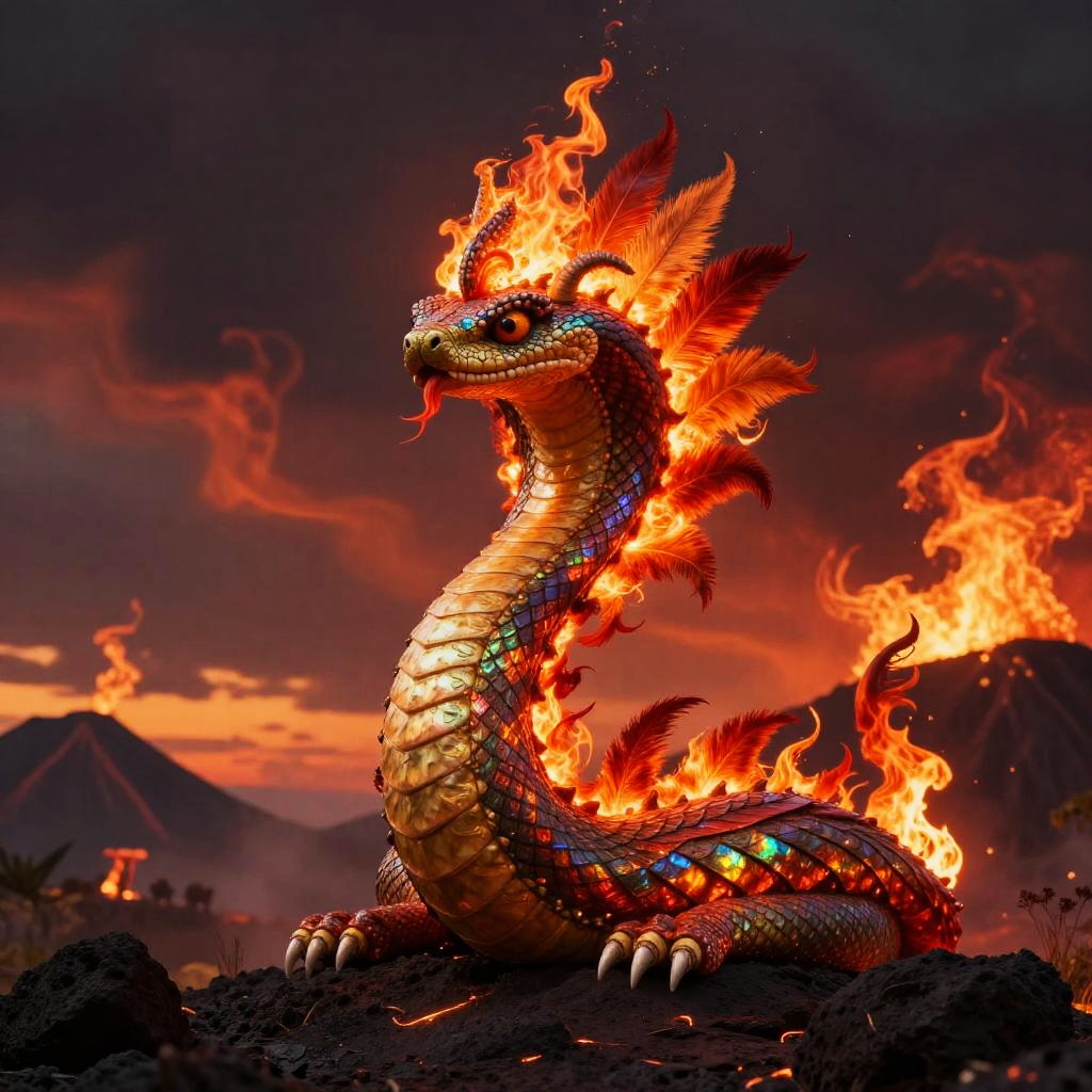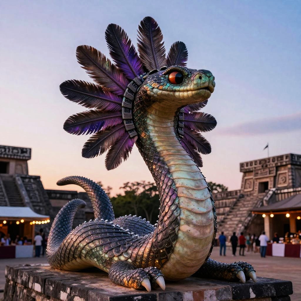 Kukulkan – Feathered serpent deity, depicted as a regal serpent spirit covered in silver feathers that gleam with ethereal luminescence, standing in a frozen tundra landscape dotted with crystalline ice formations and pale northern lights.